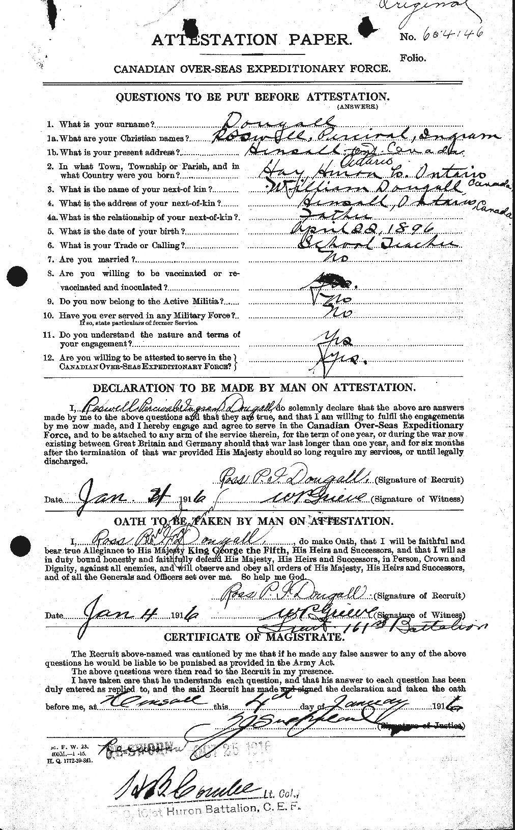 Brother, Samuel Wilfred Dougall. reg. no. 654190 joined the 161st Battalion two days after Roswell.