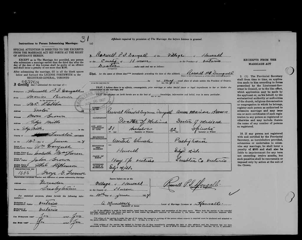 13768-27 Roswell Percival Ingram DOUGALL, 31, doctor of medicine, Hay Twp., Hensall, s/o William DOUGALL, b. Ontario & Isabella MACLAREN, married Ann Marion BROWN, 22, doctor of medicine, Lambton Co., Edys Mills, d/o John BROWN, b. Ontario & Ethel STEPHENSON, witn: M.C. FLETCHER of Exeter & Mona BROWN of Edys Mills, 14 Jun 1927 at Edy Mills.