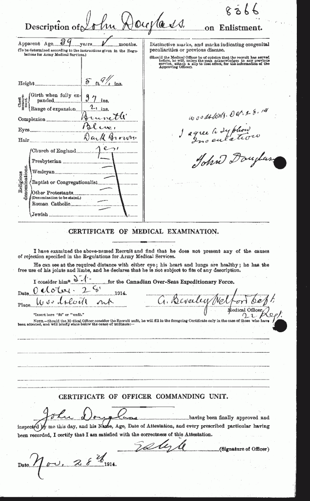 | October 29, 1914 | Enlists | Enlists with the 18th Battalion in Woodstock, Ontario. He lists his wife, Harriet Douglass, as his next-of-kin. They reside at 320 Hay Street in Woodstock. He is a 39-year old labourer with prior military experience showing 7 years service with the 74th Royal Fusiliers. |