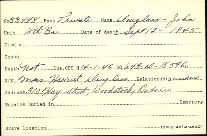 Born in Tain, Scotland, he was the son of the late Mr. and Mrs. William DOUGLAS(S). He lived in London, England for some time and came to Canada in 1905 and to Woodstock, where he has resided since, with the exception of the time he served in the First Great War with the 18th Battalion, C.E.F., in which he enlisted in London, Ontario. He was a member of the Woodstock branch of the Canadian Legion, also a member of the Dundas Street United Church. He was a plasterer by occupation and worked at this trade before and after his war service.