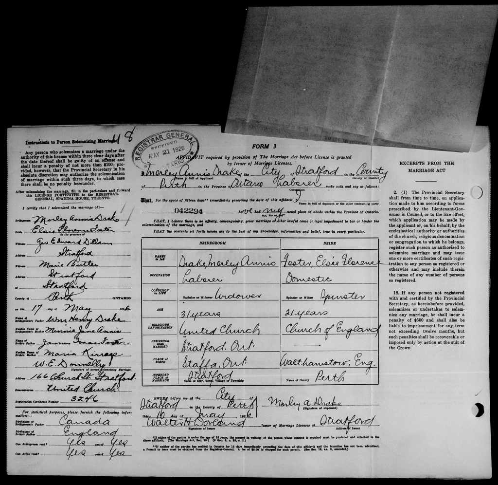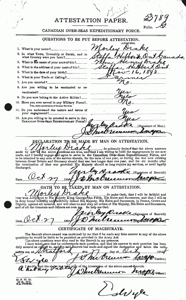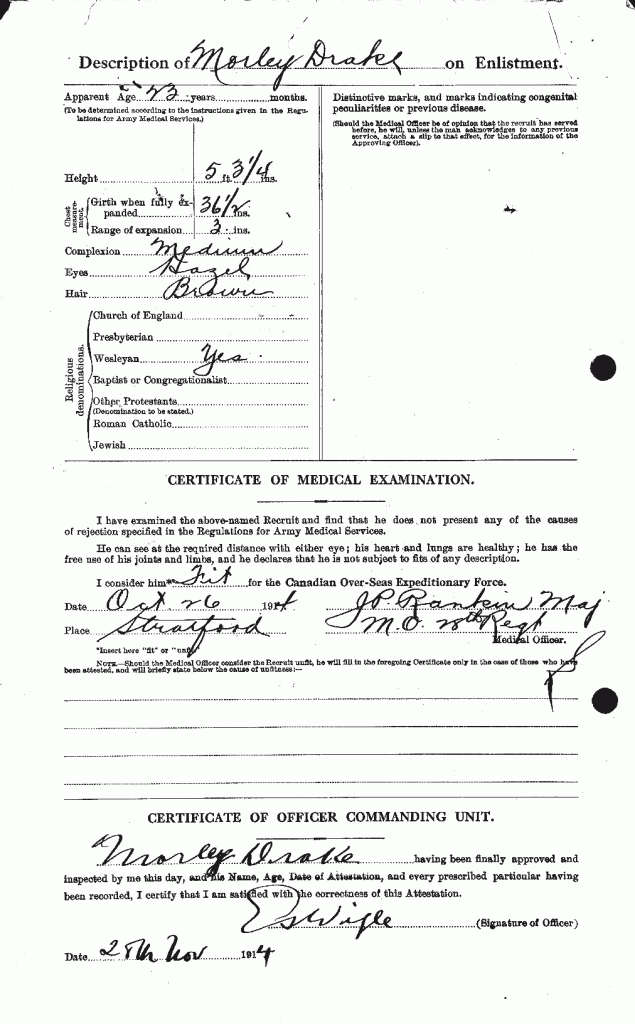 Drake, Morley Annis: Service no. 53789 Digitized Service Record Source: During research regarding 18th Battalion Association “Memory” regarding Lorenzo Kress. Find-A-Grave Share this: Click to email a link to a friend (Opens in new window) Email Click to share on Facebook (Opens in new window) Facebook Click to share on X (Opens in new window) X Click to share on Reddit (Opens in new window) Reddit Click to share on LinkedIn (Opens in new window) LinkedIn Click to print (Opens in new window) Print Click to share on Tumblr (Opens in new window) Tumblr Click to share on Pocket (Opens in new window) Pocket Click to share on Pinterest (Opens in new window) Pinterest Click to share on Telegram (Opens in new window) Telegram Click to share on WhatsApp (Opens in new window) WhatsApp Like Loading...