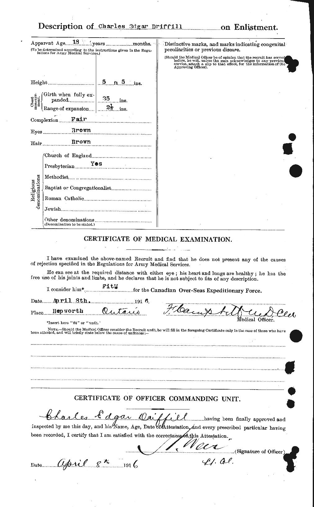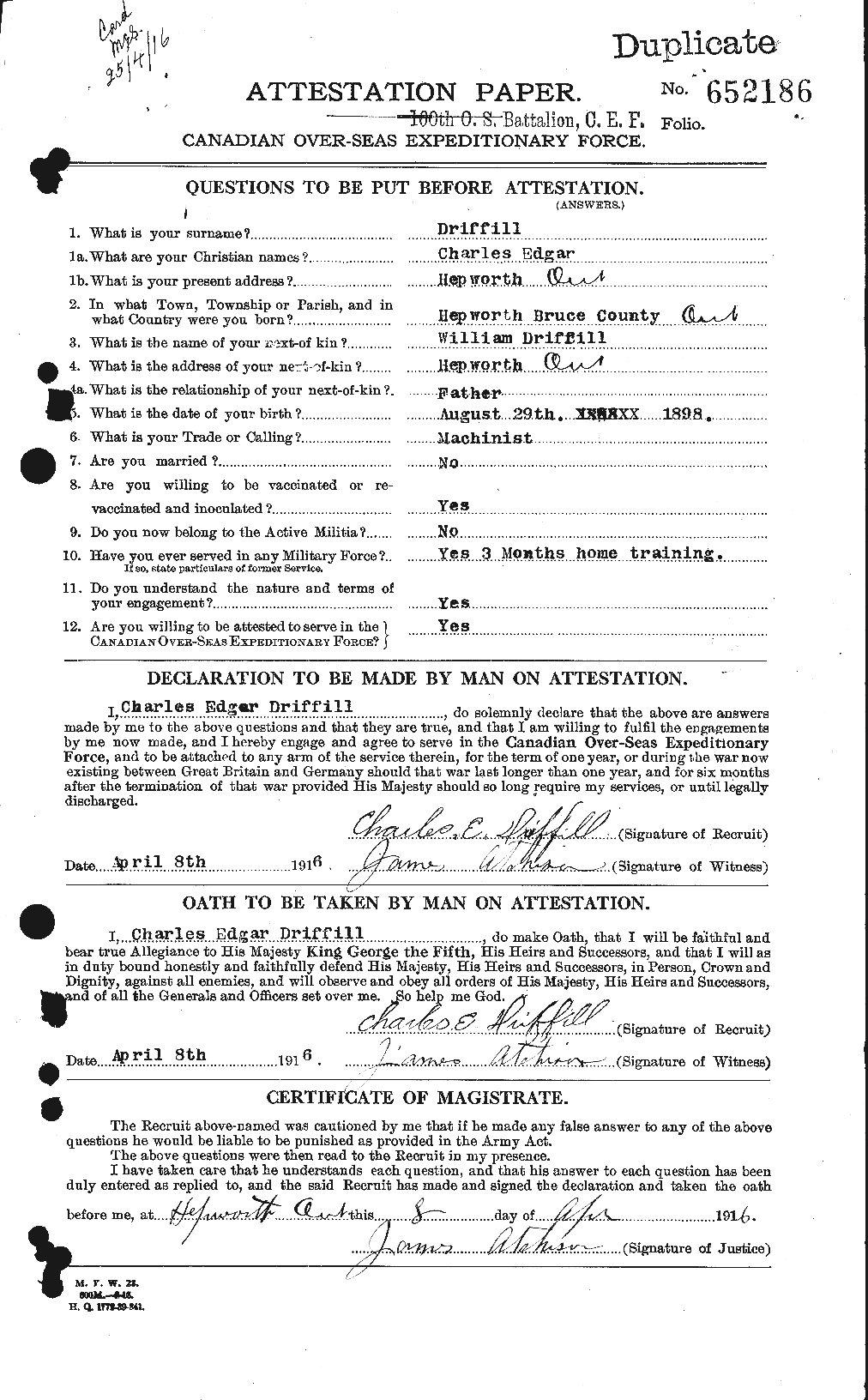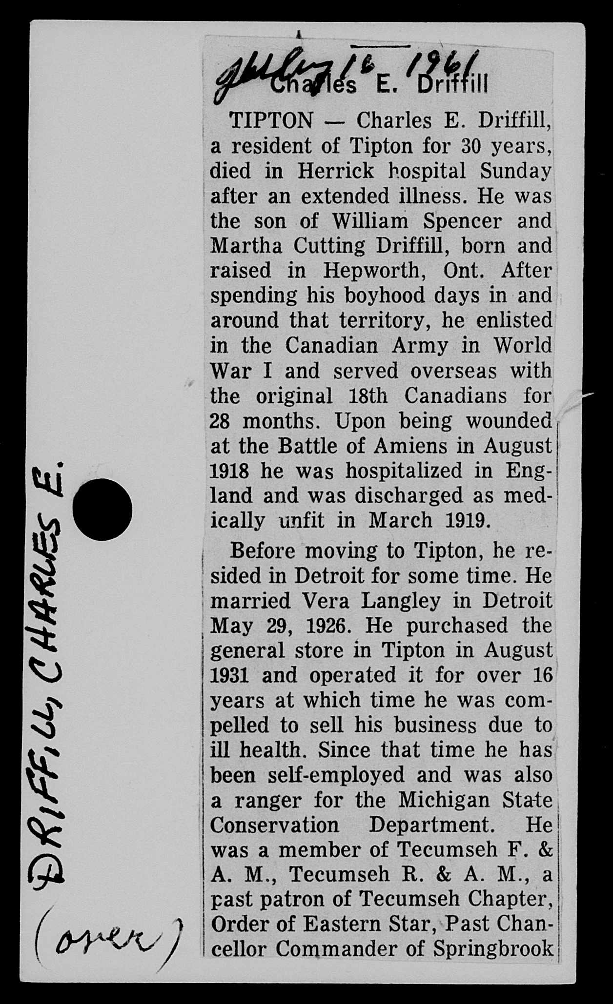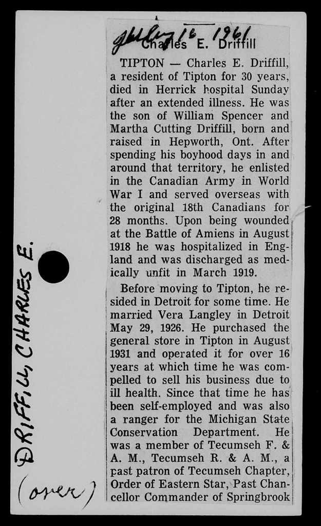 Family Search: When Charles Edgar Driffill was born on 18 August 1897, in Amabel Township, Bruce, Ontario, Canada, his father, William Spencer Driffill, was 29 and his mother, Martha Ellen Cutting, was 20. He had at least 1 daughter with Vera Irene Langley. He immigrated to Detroit, Wayne, Michigan, United States in 1925 and lived in United States in 1949 and Franklin Township, Lenawee, Michigan, United States in 1950. He registered for military service in 1916. In 1916, at the age of 19, his occupation is listed as machinist in Hepworth, Bruce, Ontario, Canada. He died on 16 July 1961, in Tipton, Franklin Township, Lenawee, Michigan, United States, at the age of 63, and was buried in Tipton, Franklin Township, Lenawee, Michigan, United States.