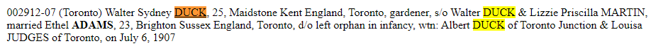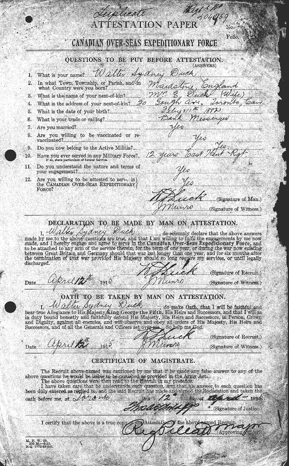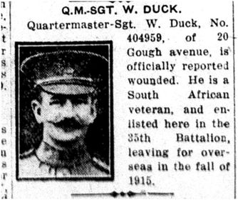 Duck, Walter Sydney: Service no. 404959 Digitized Service Record Source: Promotion record of CSM Charles Green. Find-A-Grave Duck, Walter Sydney: Service no. 404959. Source: Toronto Telegram. August 1918. Per news clipping post by David Archer at 18th Battalion Facebook Page (not group). Share this: Click to email a link to a friend (Opens in new window) Email Click to share on Facebook (Opens in new window) Facebook Click to share on X (Opens in new window) X Click to share on Reddit (Opens in new window) Reddit Click to share on LinkedIn (Opens in new window) LinkedIn Click to print (Opens in new window) Print Click to share on Tumblr (Opens in new window) Tumblr Click to share on Pocket (Opens in new window) Pocket Click to share on Pinterest (Opens in new window) Pinterest Click to share on Telegram (Opens in new window) Telegram Click to share on WhatsApp (Opens in new window) WhatsApp Like Loading...