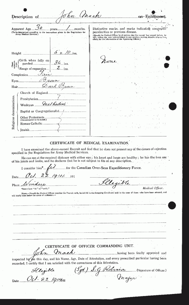 | October 22, 1914 | Enlisted | Enlisted under the assumed name of John Mack. He claims to be born on September 24, 1884 in Tilbury, Ontario. His next of kin is a Mrs. John Krieg of South Euclid, Ohio, U.S.A. His trade is as a carpenter and he has prior military experience with the 21st Regiment. He enlists at Windsor, Ontario under the regimental number of 53259. |