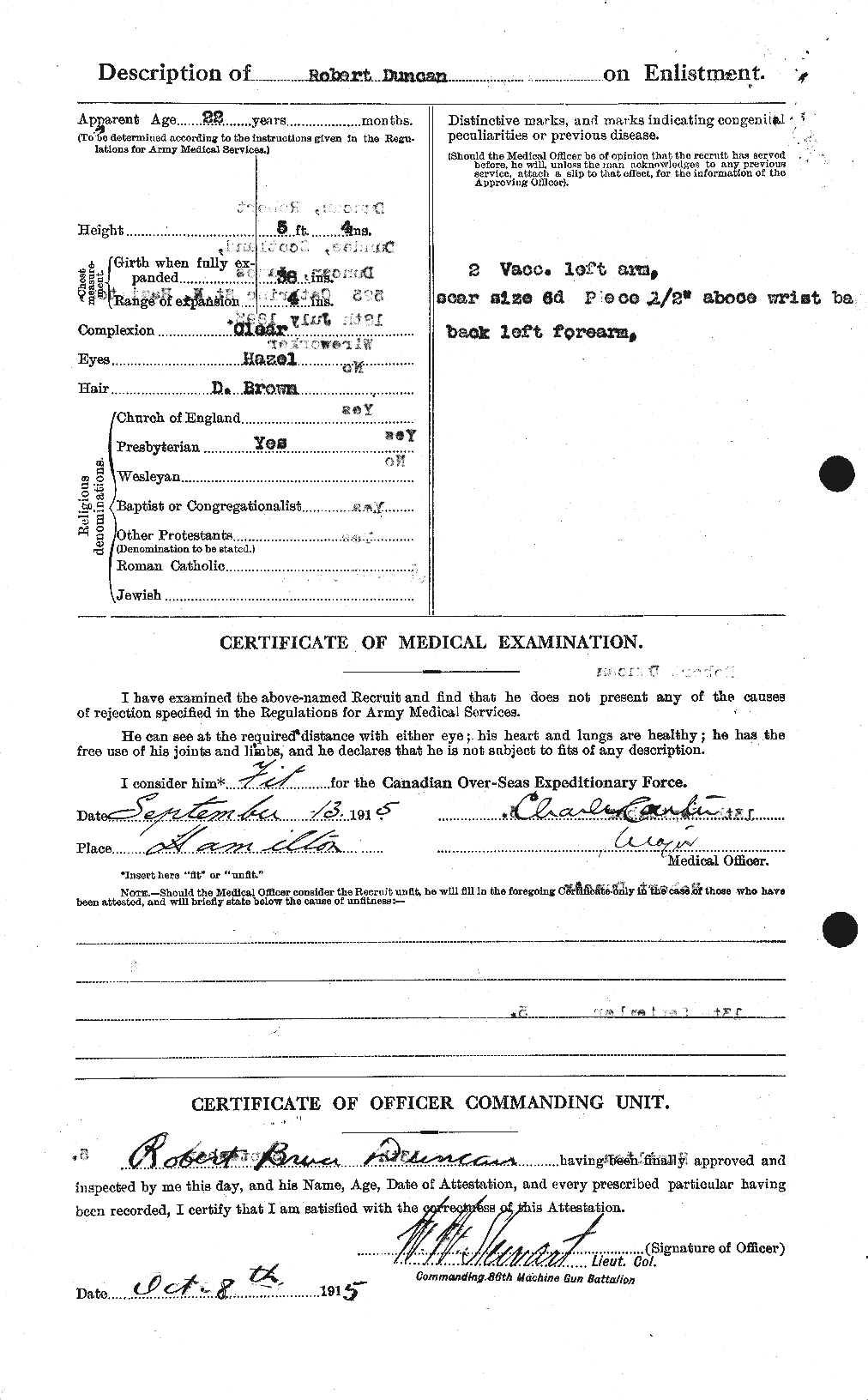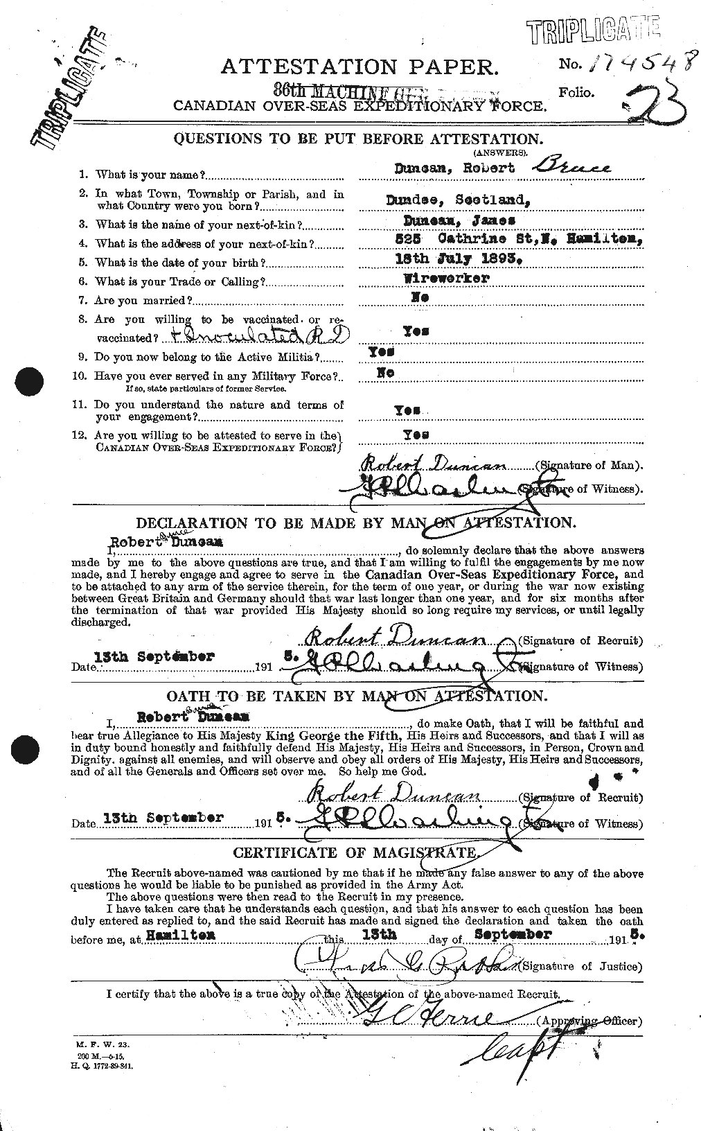 Family Search: Corporal Robert Bruce Duncan was born on 18 July 1893, in Dundee, Scotland, United Kingdom as the son of James Duthie Duncan and Mary Ann Gowans. He had at least 1 son and 2 daughters with Ethel Lambert. He immigrated to Canada in 1913 and lived in Hamilton, Wentworth, Ontario, Canada for about 47 years. He registered for military service in 1915. In 1915, at the age of 22, his occupation is listed as wire worker, b. greening wire company in Hamilton, Wentworth, Ontario, Canada. He died on 10 February 1969, in Hamilton, Hamilton-Wentworth, Ontario, Canada, at the age of 75, and was buried in Woodland Cemetery, Hamilton, Ontario, Canada