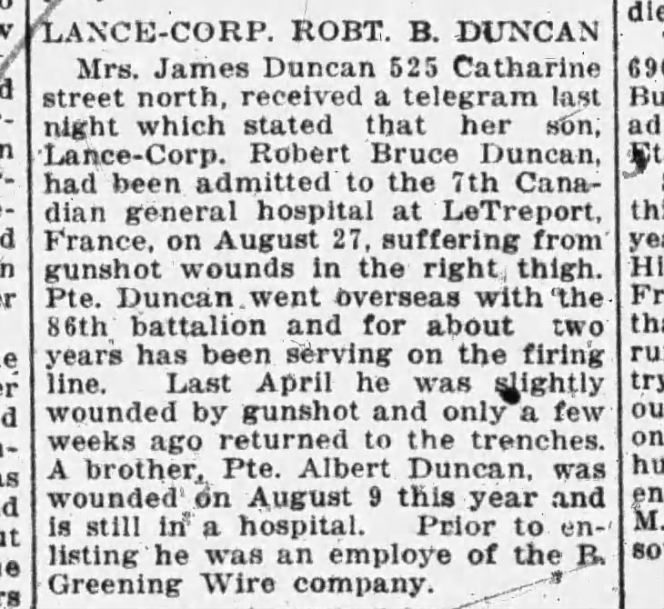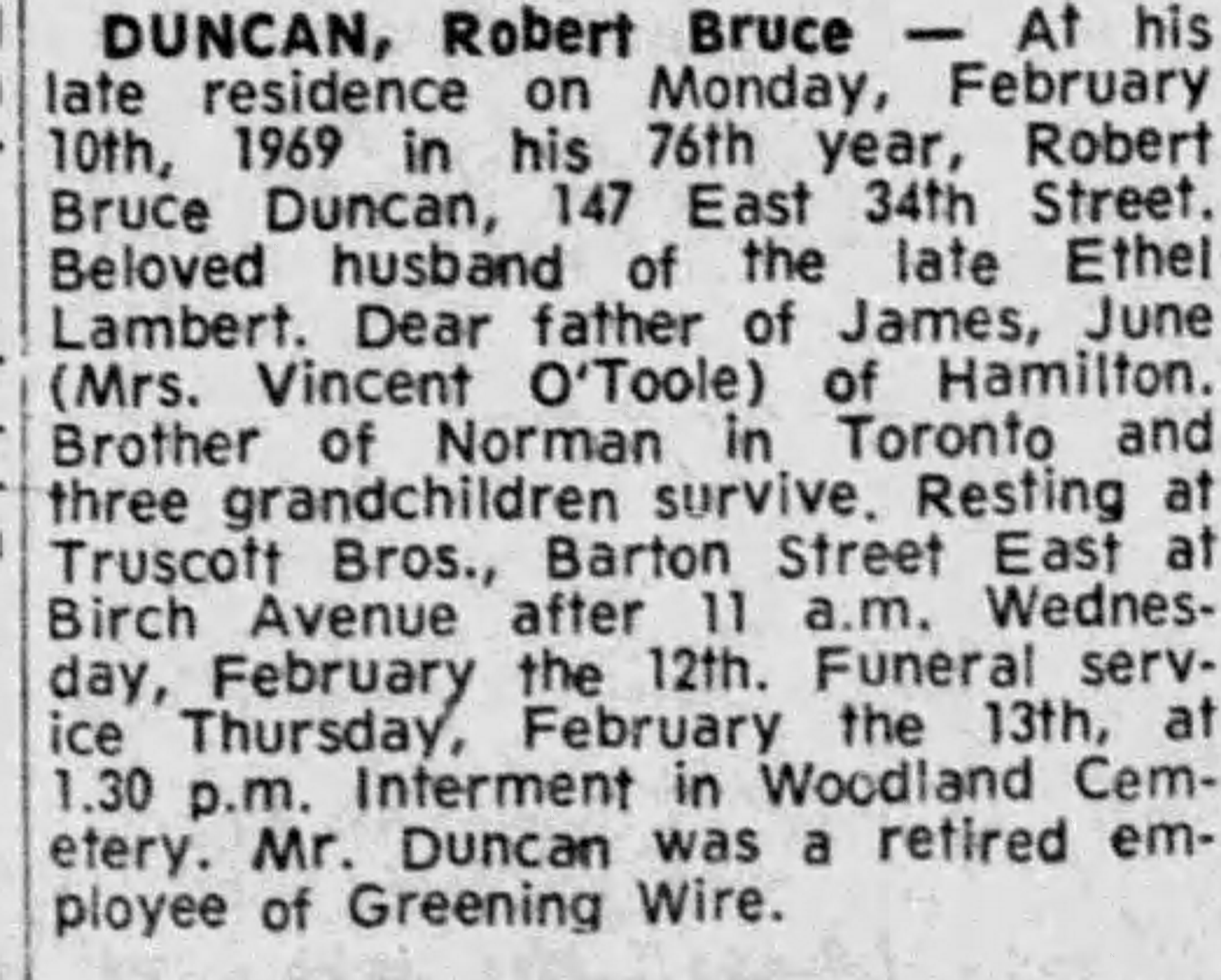 Family Search: Corporal Robert Bruce Duncan was born on 18 July 1893, in Dundee, Scotland, United Kingdom as the son of James Duthie Duncan and Mary Ann Gowans. He had at least 1 son and 2 daughters with Ethel Lambert. He immigrated to Canada in 1913 and lived in Hamilton, Wentworth, Ontario, Canada for about 47 years. He registered for military service in 1915. In 1915, at the age of 22, his occupation is listed as wire worker, b. greening wire company in Hamilton, Wentworth, Ontario, Canada. He died on 10 February 1969, in Hamilton, Hamilton-Wentworth, Ontario, Canada, at the age of 75, and was buried in Woodland Cemetery, Hamilton, Ontario, Canada