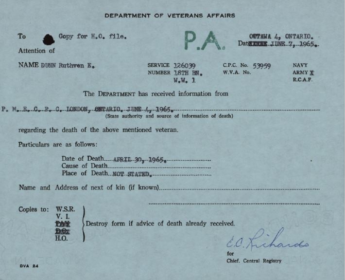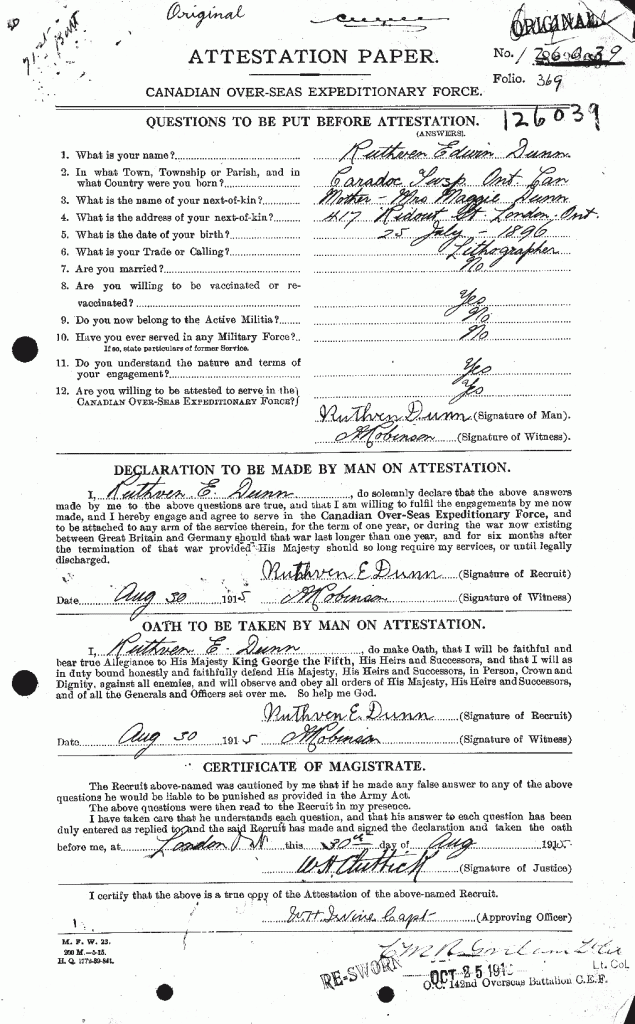 Dunn, Ruthven Edwin: Service no. 126039 Digitized Service Record Source: Per a record of promotion, probably Charles Rogers. Find-A-Grave Share this: Click to email a link to a friend (Opens in new window) Email Click to share on Facebook (Opens in new window) Facebook Click to share on X (Opens in new window) X Click to share on Reddit (Opens in new window) Reddit Click to share on LinkedIn (Opens in new window) LinkedIn Click to print (Opens in new window) Print Click to share on Tumblr (Opens in new window) Tumblr Click to share on Pocket (Opens in new window) Pocket Click to share on Pinterest (Opens in new window) Pinterest Click to share on Telegram (Opens in new window) Telegram Click to share on WhatsApp (Opens in new window) WhatsApp Like Loading...