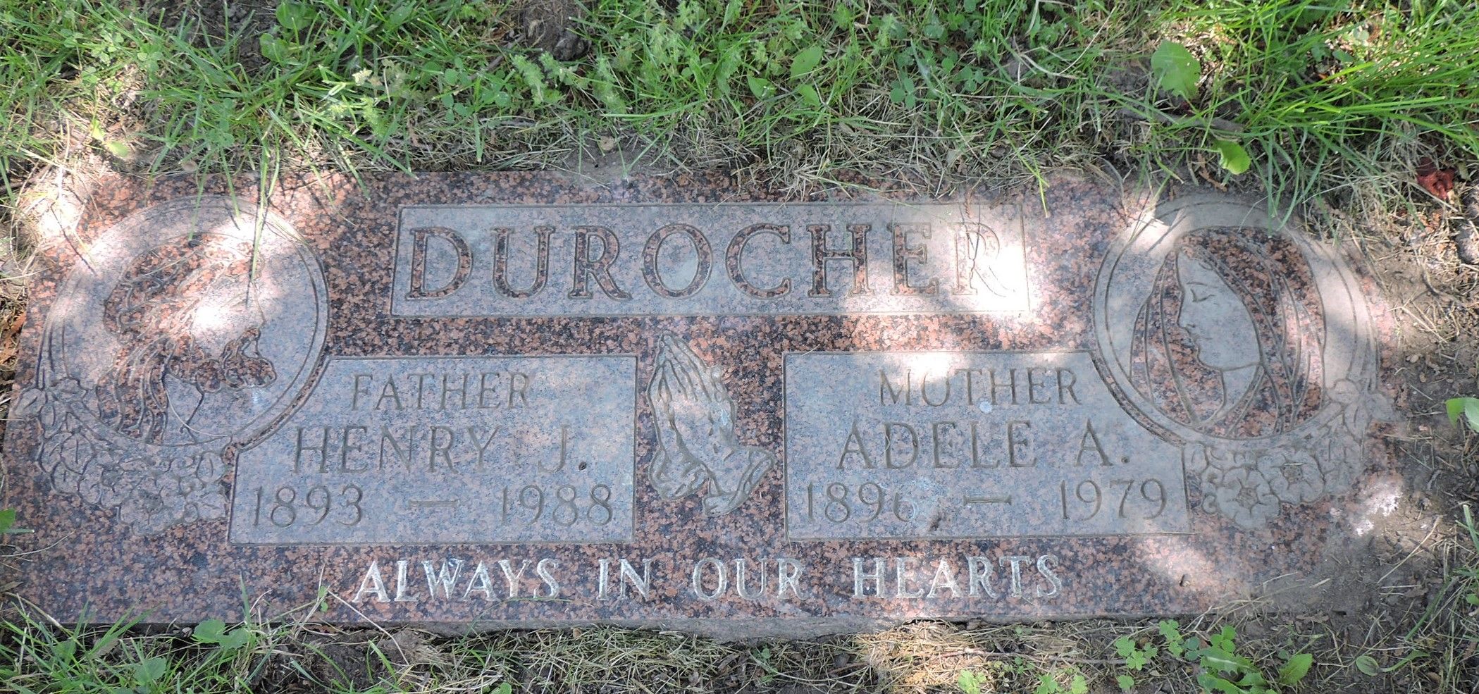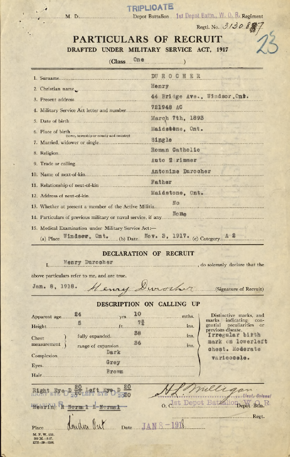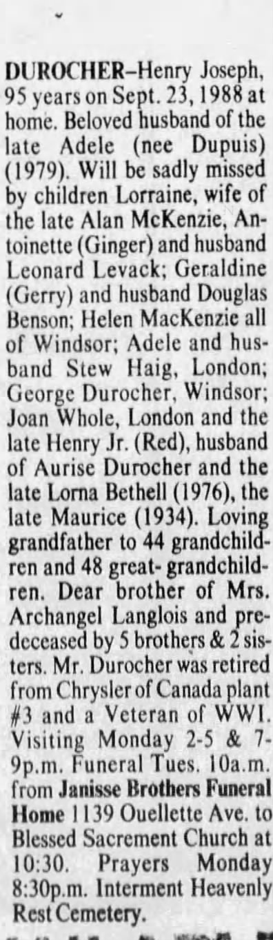 Family Search: When Private Henry Joseph Durocher was born on 7 March 1893, in Maidstone Township, Essex, Ontario, Canada, his father, Antoine Israel Quiton Durocher, was 38 and his mother, Elizabeth Ouellette, was 34. He married Adele Jessie Alphonsine Dupuis on 10 January 1922, in Sandwich, Essex, Ontario, Canada. They were the parents of at least 3 sons and 6 daughters. He lived in Essex, Ontario, Canada in 1911 and Windsor, Sandwich, Essex, Ontario, Canada in 1931. He registered for military service in 1918. In 1931, at the age of 38, his occupation is listed as auto trimmer in Windsor, Essex, Ontario, Canada. He died on 23 September 1988, in Windsor, Essex, Ontario, Canada, at the age of 95, and was buried in Heavenly Rest Catholic Cemetery, Windsor, Essex, Ontario, Canada.