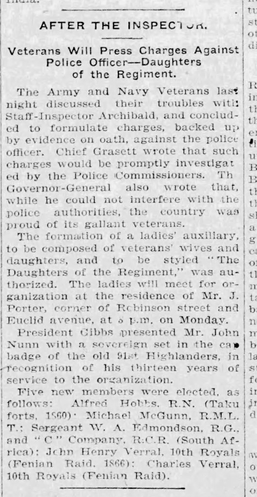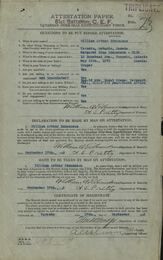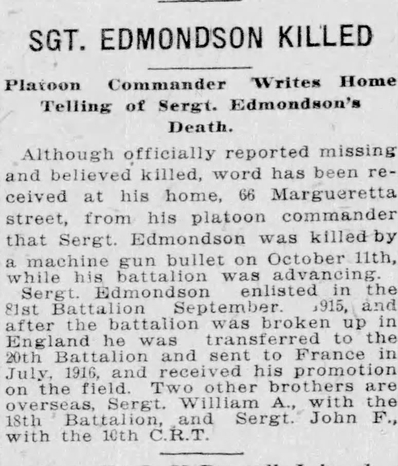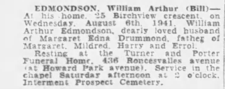 Family Search: When Private William Arthur Edmondson was born on 25 May 1872, in Toronto, Ontario, Canada, his father, William Henry Edmondson, was 30 and his mother, Martha Elizabeth Adams, was 21. He married Margaret Edna Drummond on 16 December 1903, in York Township, Toronto, Ontario, Canada. They were the parents of at least 2 sons and 2 daughters. He died on 6 August 1941, in Toronto, Ontario, Canada, at the age of 69, and was buried in Prospect Cemetery, Toronto, Ontario, Canada.