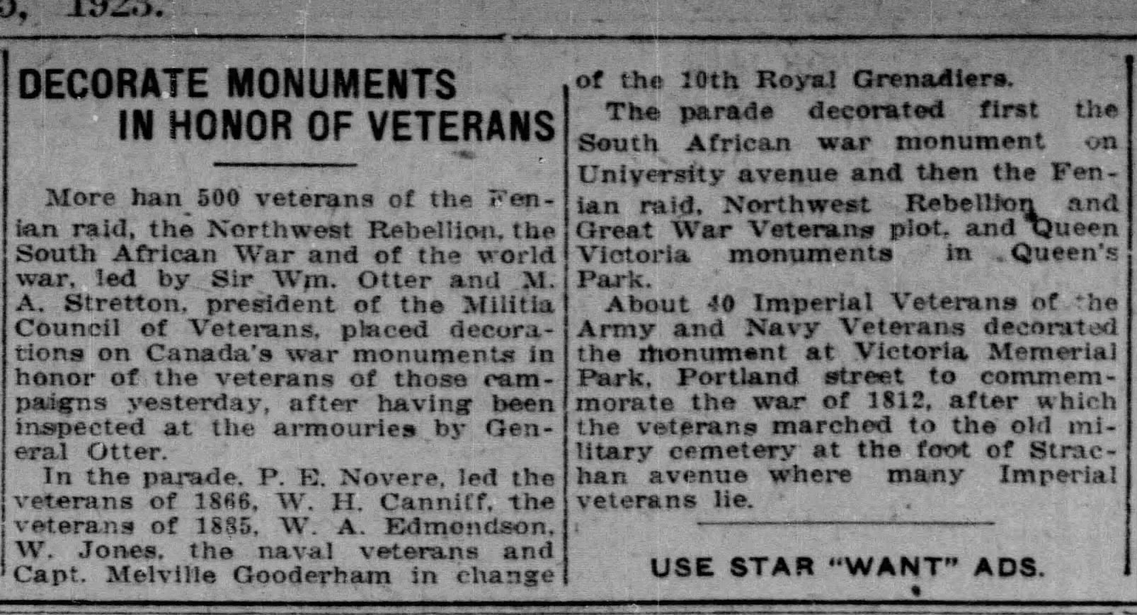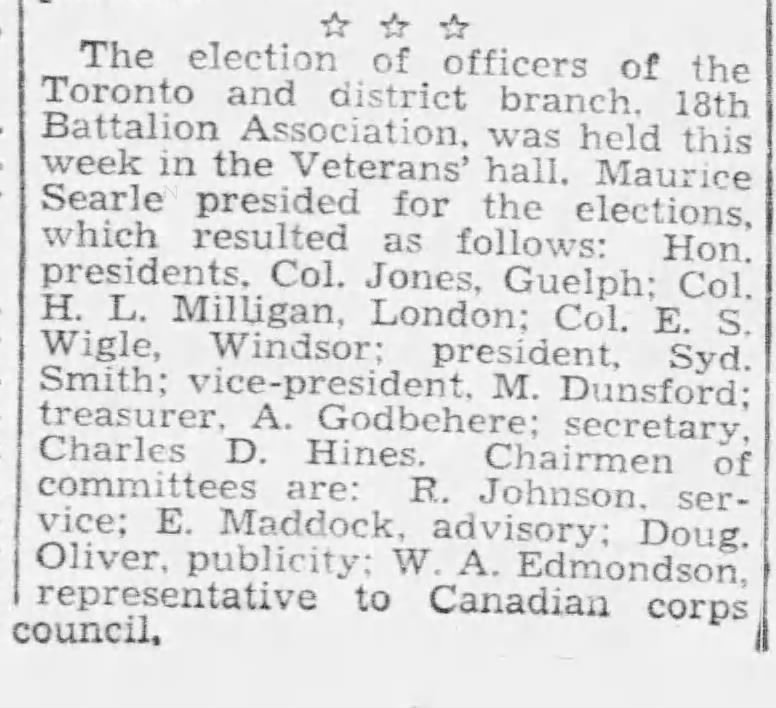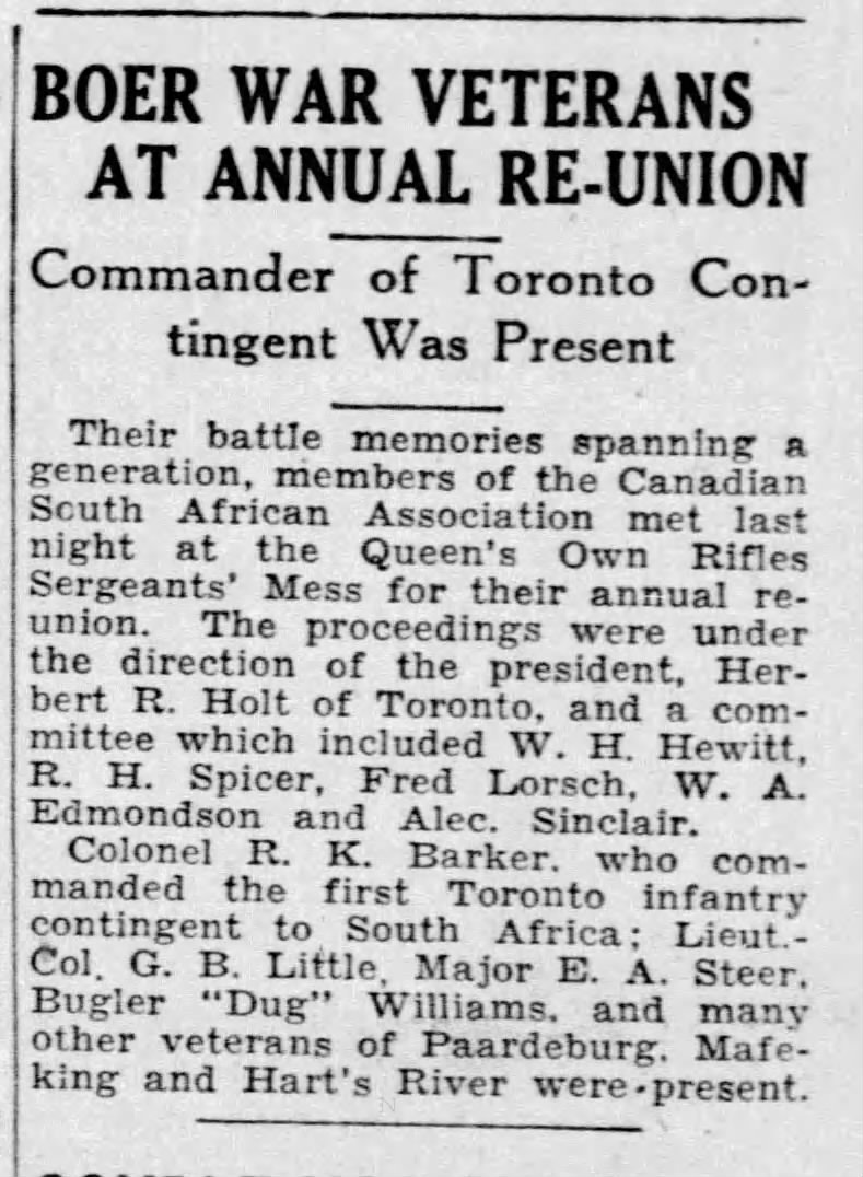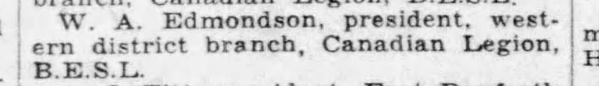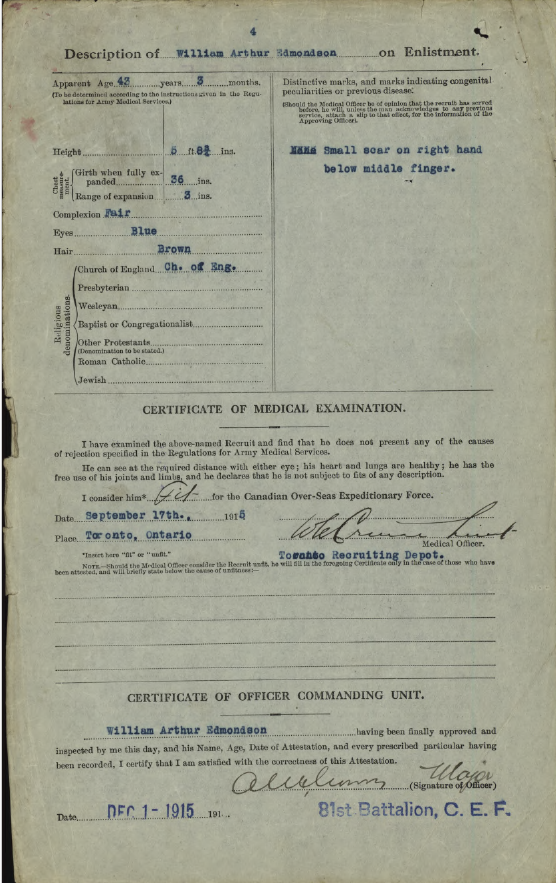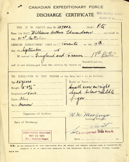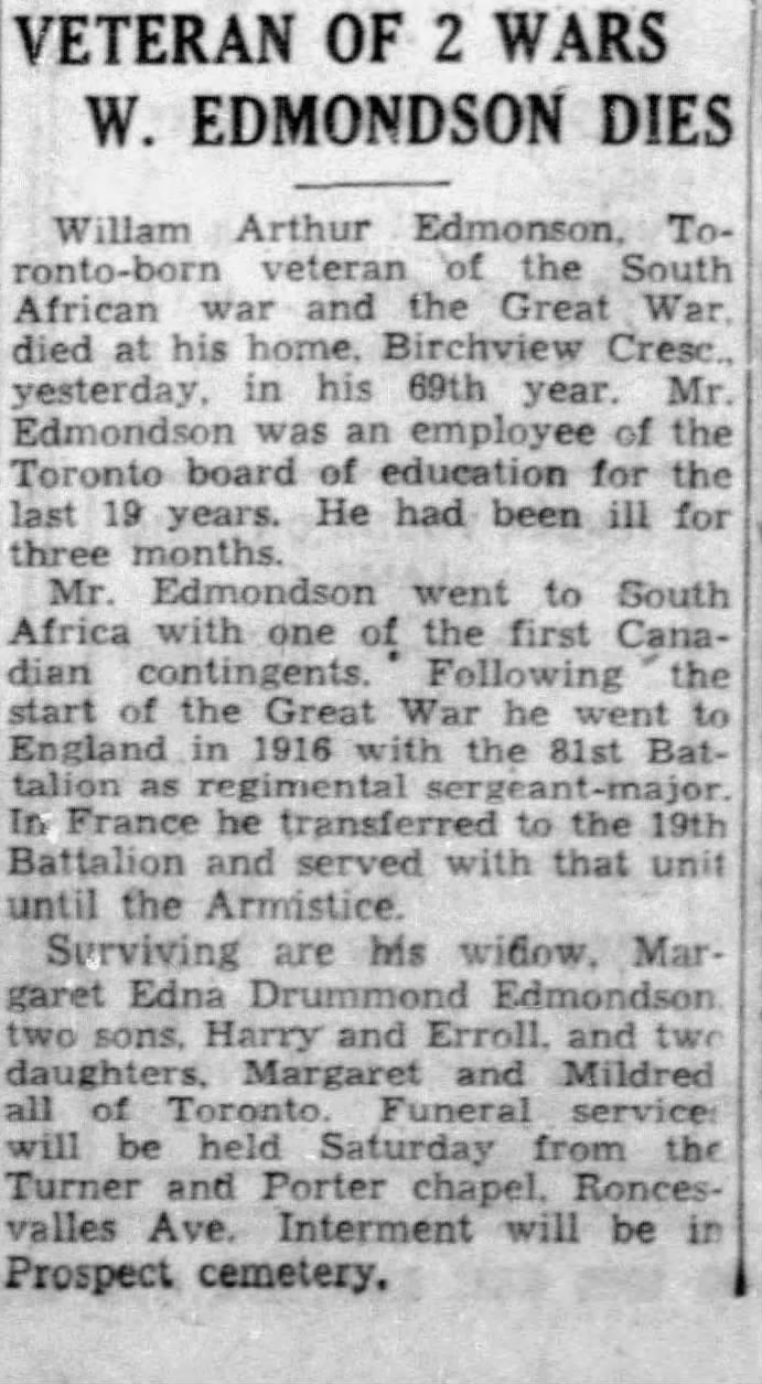 Family Search: When Private William Arthur Edmondson was born on 25 May 1872, in Toronto, Ontario, Canada, his father, William Henry Edmondson, was 30 and his mother, Martha Elizabeth Adams, was 21. He married Margaret Edna Drummond on 16 December 1903, in York Township, Toronto, Ontario, Canada. They were the parents of at least 2 sons and 2 daughters. He died on 6 August 1941, in Toronto, Ontario, Canada, at the age of 69, and was buried in Prospect Cemetery, Toronto, Ontario, Canada.