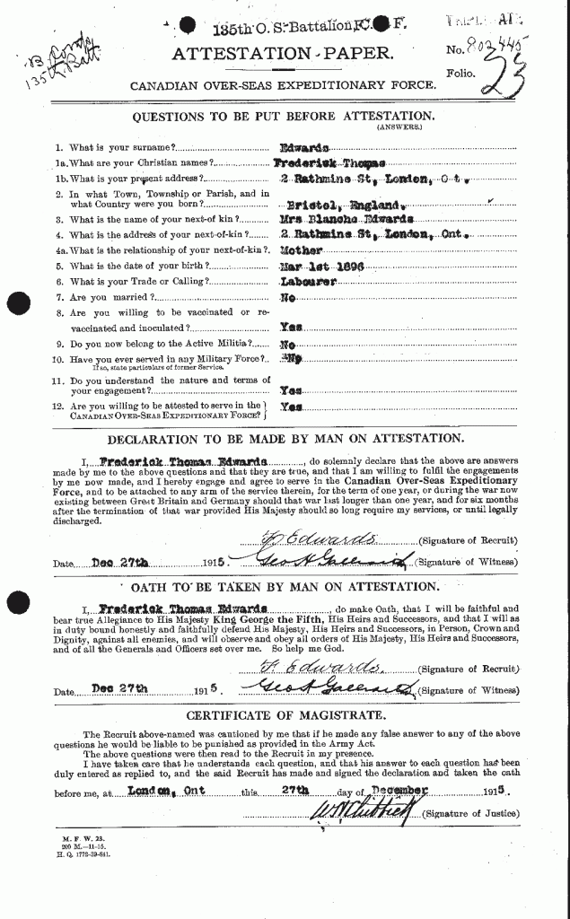 This man enlisted with the 135th Overseas Battalion at London, Ontario, on 27 December 1915. He was a single labourer living at 2 Rathmine Street, London, Ontario. He was of the Baptist faith.