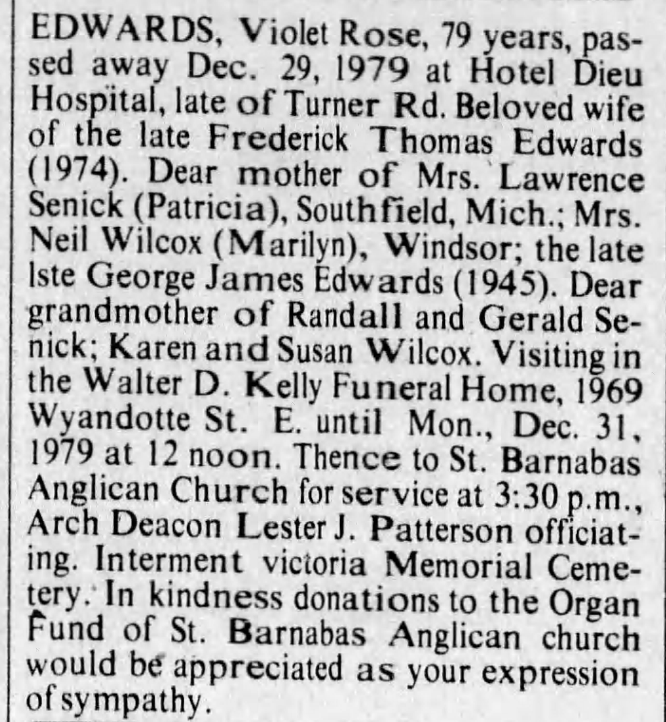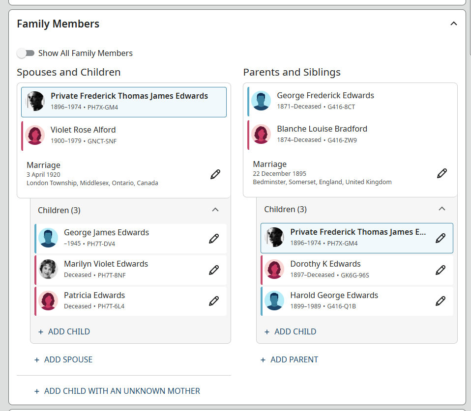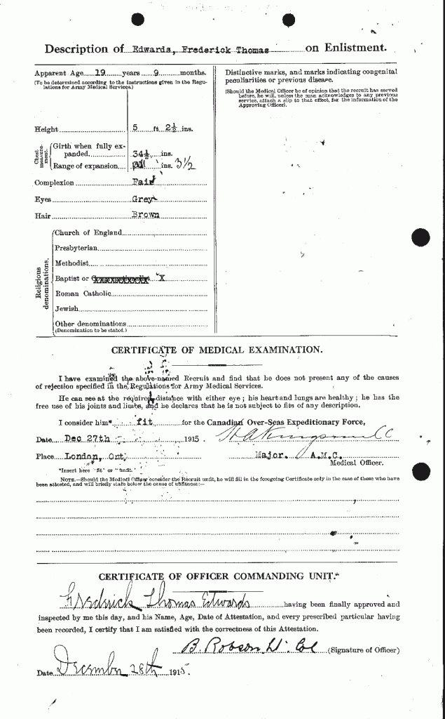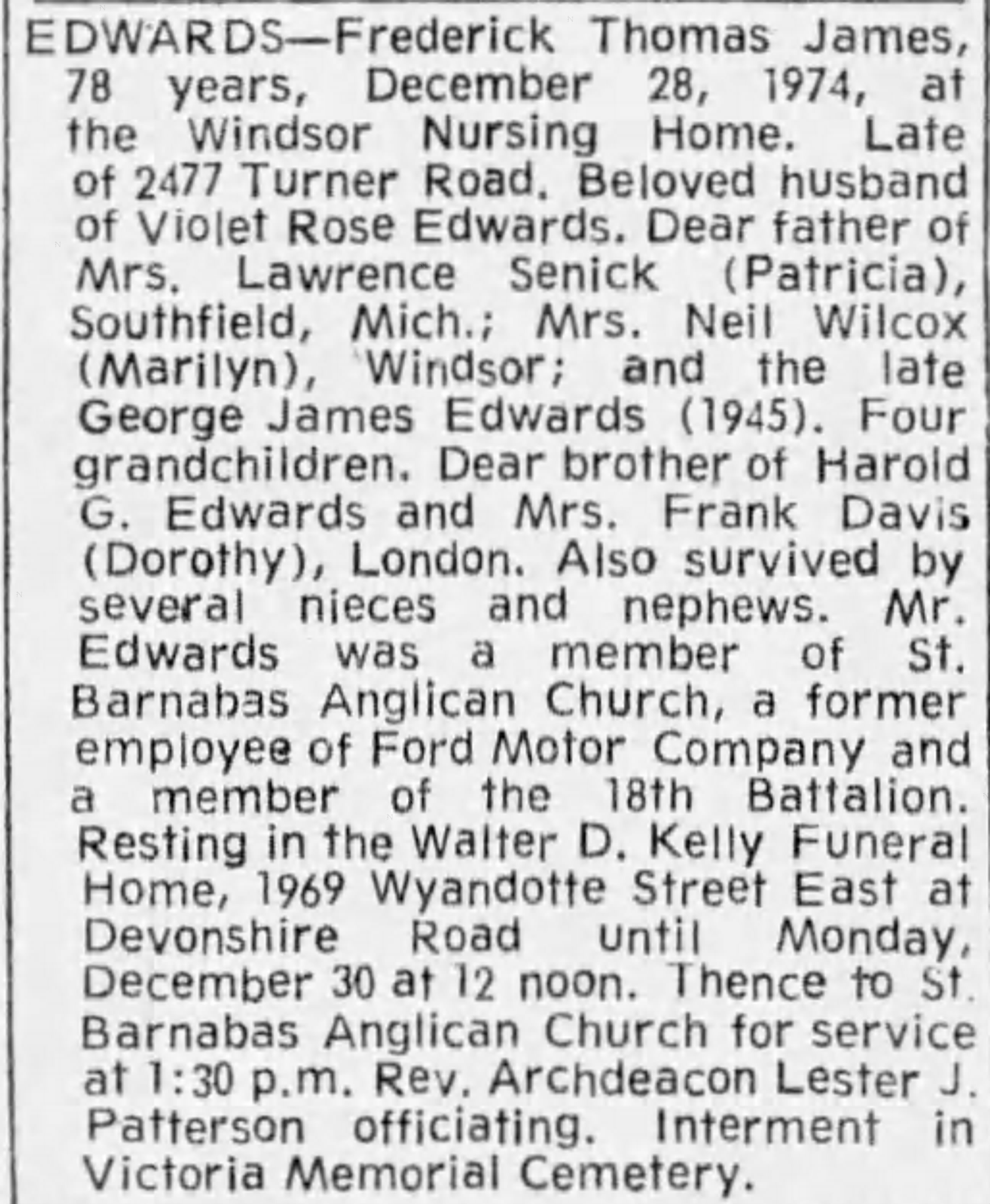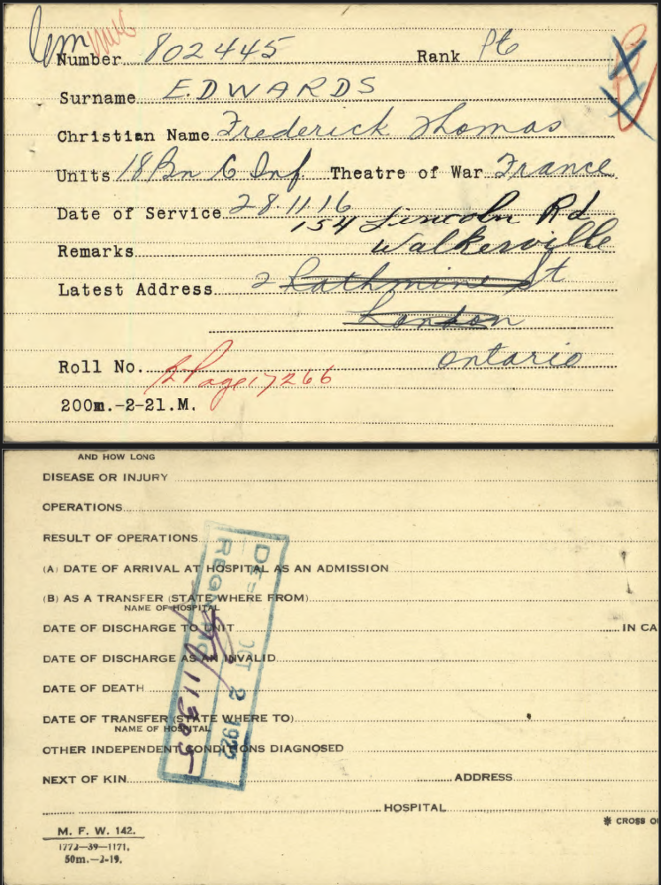 Family Search: When Private Frederick Thomas James Edwards was born in March 1896, in Bedminster, Bristol, England, United Kingdom, his father, George Frederick Edwards, was 25 and his mother, Blanche Louise Bradford, was 22. He married Violet Rose Alford on 3 April 1920, in London Township, Middlesex, Ontario, Canada. They were the parents of at least 1 son and 2 daughters. He immigrated to Canada in 1913 and lived in London, Ontario, Canada, in 1915 and Walkerville, Windsor, Essex, Ontario, Canada, in 1922. He registered for military service in 1915. His occupation is listed as Ford Motor Company in Windsor, Essex, Ontario, Canada. He died on 28 December 1974, in Windsor, Essex, Ontario, Canada, at the age of 78, and was buried in Victoria Memorial Gardens, Oldcastle, Essex, Ontario, Canada.