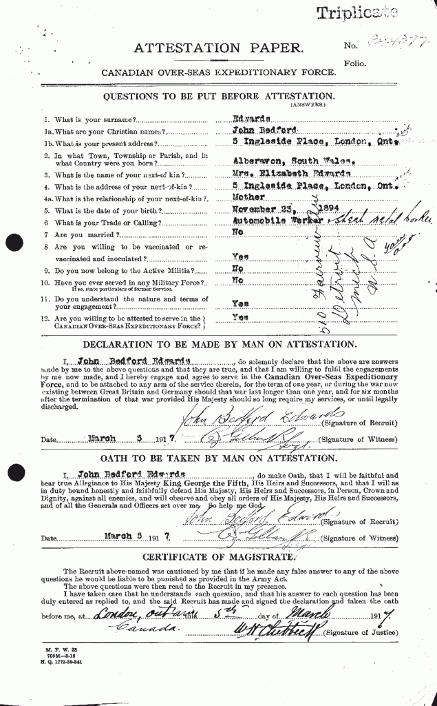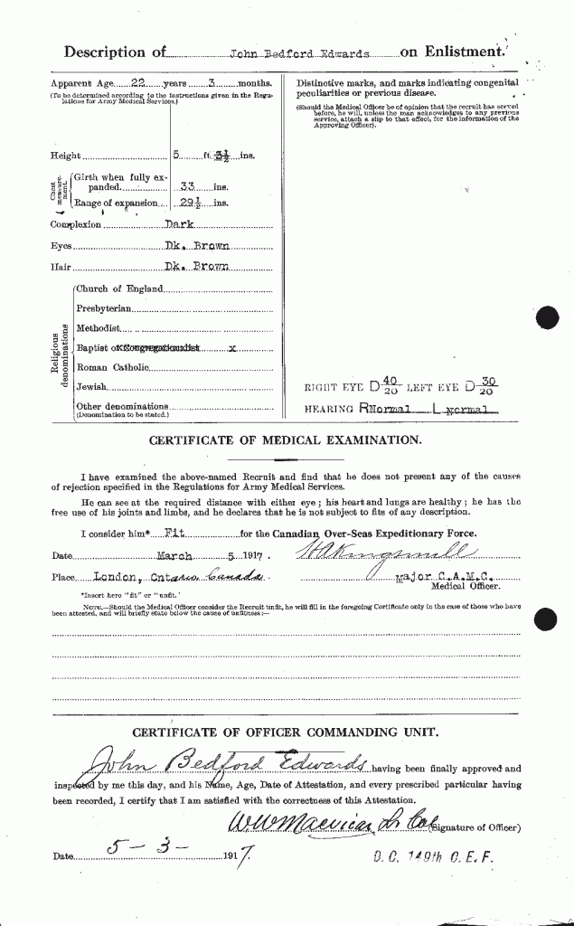 | 5 March 1917 | Enlists | Enlists with the 149th Overseas Battalion at London, Ontario. His attestation paper relates he was an automobile worker standing 5’3.5” tall. He was of the Baptist faith. He was not married and had no military experience. His next-of-kin was his mother who resided at 5 Ingleside Place, London, Ontario. It is noted in his Particulars of Family of an Officer or Man Enlisted in the C.E.F. that his father, John Henry Edwards was serving in the 7th Regiment at London, Ontario. |