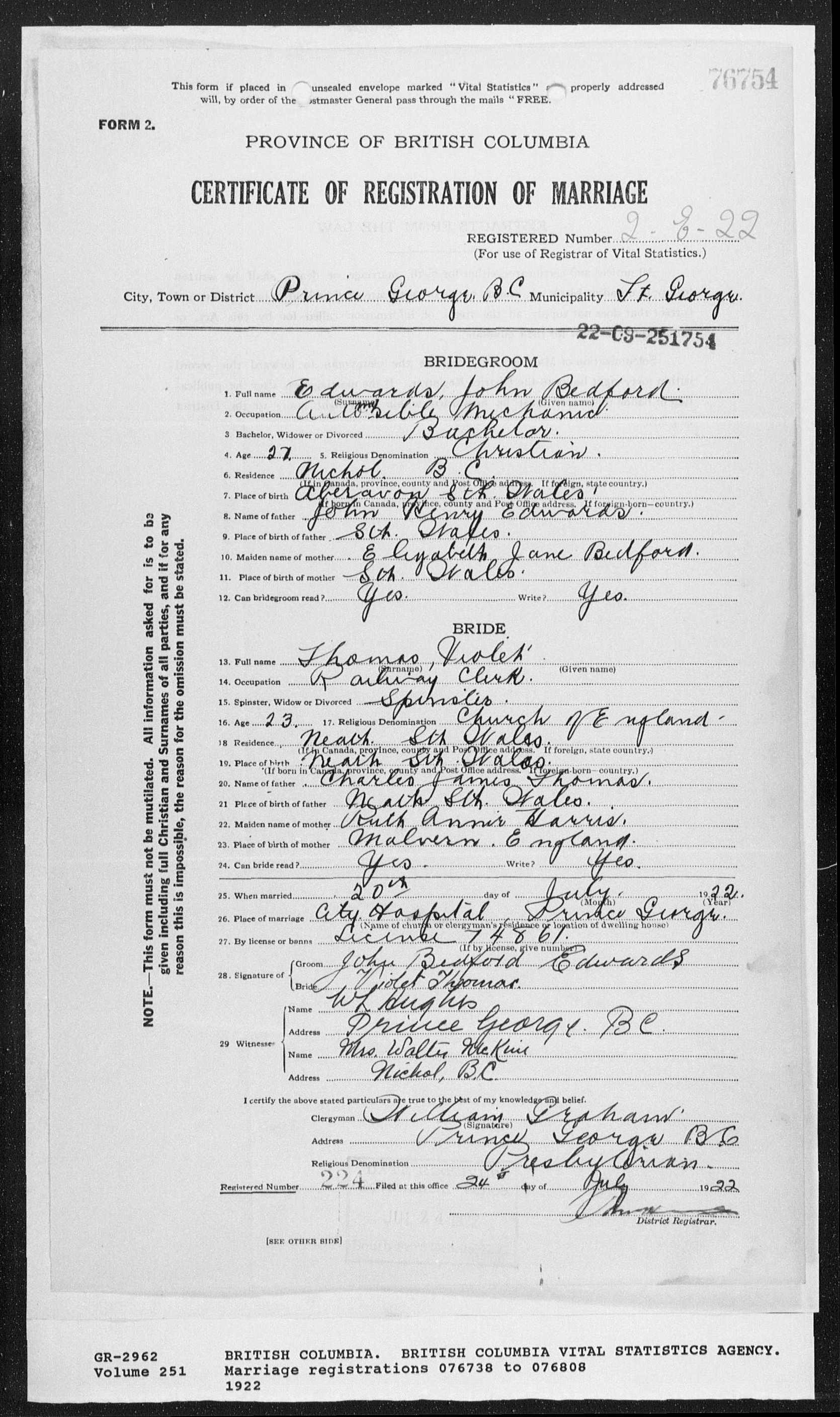 | 30 September 1922 | Address Updates | Address updated from 510 Fairview Avenue, Detroit, Michigan to Beoford Ranch, Nichol, British Columbia. |