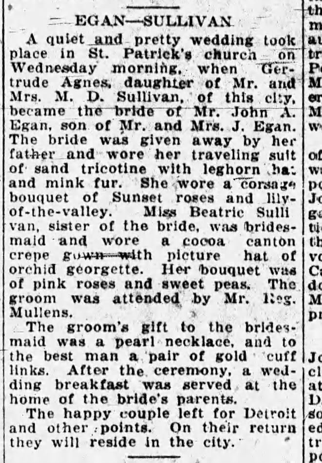 Family Search: When Corporal John Alexander Egan was born on 14 February 1888, in Kingston, Frontenac, Ontario, Canada, his father, John Egan, was 26 and his mother, Elizabeth Sarah Jane Newman, was 21. He married Agnes Gertrude Sullivan on 6 June 1923, in Hamilton, Hamilton-Wentworth, Ontario, Canada. They were the parents of at least 1 daughter. He lived in Hamilton, Ontario, Canada for about 10 years and Hamilton, Wentworth, Ontario, Canada in 1922. He registered for military service in 1915. In 1915, at the age of 27, his occupation is listed as machinist toolmaker in Hamilton, Wentworth, Ontario, Canada. He died on 1 October 1977, in Hamilton, Hamilton-Wentworth, Ontario, Canada, at the age of 89, and was buried in Holy Sepulchre Catholic Cemetery, Burlington, Halton, Ontario, Canada.