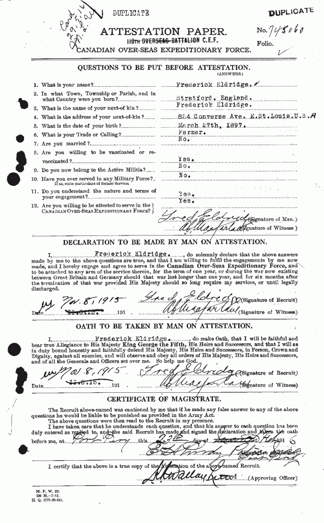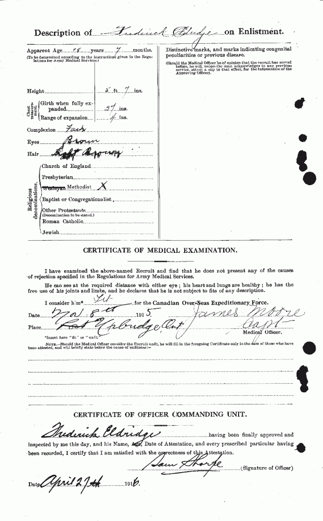 Family Search: Frederick Eldridge was born on 27 March 1898, in Stafford, Staffordshire, England, United Kingdom. He married Lulu Eveline Hodgson on 10 February 1926, in Palm Beach, Florida, United States. He lived in Calgary, Calgary Metropolitan Region, Alberta, Canada in 1921 and Glen Cove, Nassau, New York, United States in 1930. He registered for military service in 1915. In 1915, at the age of 17, his occupation is listed as farmer. He died on 23 September 1954, at the age of 56, and was buried in Park Lawn Cemetery, Toronto, Ontario, Canada.
