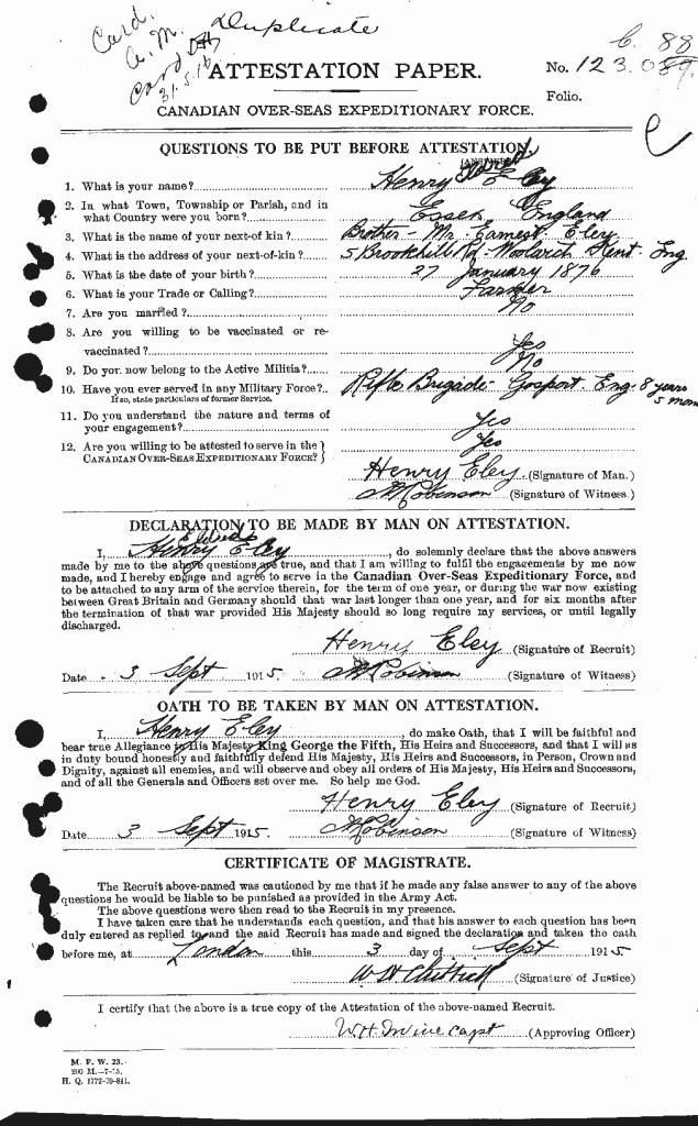Aylmer, Jan. 15 – Henry E. Eley, 50 year-old ex-service man, who died in Westminster Hospital Tuesday, had made his home with Mr and Mrs Stokes of Jaffa before he joined the army in 1915. He was a patient at the hospital for ten years. Mr. Eley served overseas for the duration of the war, returning in 1918. He was a member of Jaffa Baptist church. He was born in England. Surviving him are two sisters, Miss Ada Eley and Mrs. Alderton, of Southend, Essex County, England. Funeral services will be held at the Atkinson funeral home, Aylmer, Thursday afternoon, at 2:30 o’clock. Rev. W. D. Stenlake will officiate. The Aylmer Canadian Legion will attend in a body. Interment will be made in Aylmer cemetery.”