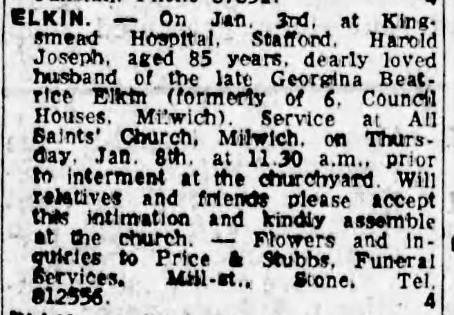 Family Search: When Sergeant Harold Joseph Elkin was born on 19 February 1895, in Milwich, Staffordshire, England, United Kingdom, his father, Benjamin Thomas Elkin, was 27 and his mother, Annie Bedson, was 24. He married Georgina Beatrice Bailey in 1918, in Camberwell, London, England, United Kingdom. He immigrated to Canada in 1913 and lived in Gayton, Staffordshire, England, United Kingdom in 1920. He registered for military service in 1915. In 1915, at the age of 20, his occupation is listed as cook in Toronto, Ontario, Canada. He died on 3 January 1981, in Staffordshire, England, United Kingdom, at the age of 85.