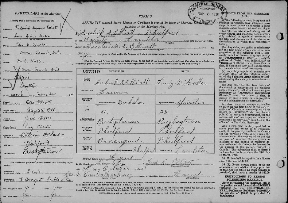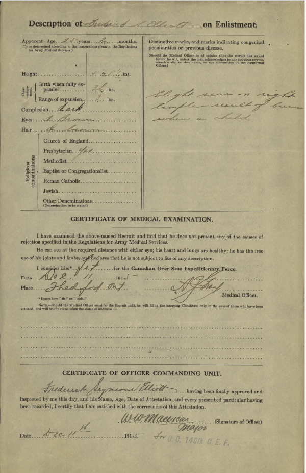 Family Search: When Private Frederick Seymour Elliott was born on 12 October 1889, in Bosanquet, Lambton, Ontario, Canada, his father, Robert Elliot, was 36 and his mother, Elizabeth Bell, was 35. He married Lucy Devine Fuller on 30 October 1920, in Forest, Frontenac, Ontario, Canada. They were the parents of at least 1 son. He lived in Lambton, Ontario, Canada in 1901 and Thedford, Lambton, Ontario, Canada in 1915. He registered for military service in 1915. In 1915, at the age of 26, his occupation is listed as engineer in Thedford, Lambton, Ontario, Canada. He died in 1951, at the age of 62, and was buried in Lakeview Cemetery, Sarnia, Lambton, Ontario, Canada.