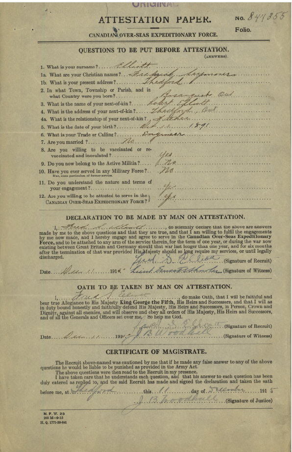 Family Search: When Private Frederick Seymour Elliott was born on 12 October 1889, in Bosanquet, Lambton, Ontario, Canada, his father, Robert Elliot, was 36 and his mother, Elizabeth Bell, was 35. He married Lucy Devine Fuller on 30 October 1920, in Forest, Frontenac, Ontario, Canada. They were the parents of at least 1 son. He lived in Lambton, Ontario, Canada in 1901 and Thedford, Lambton, Ontario, Canada in 1915. He registered for military service in 1915. In 1915, at the age of 26, his occupation is listed as engineer in Thedford, Lambton, Ontario, Canada. He died in 1951, at the age of 62, and was buried in Lakeview Cemetery, Sarnia, Lambton, Ontario, Canada.