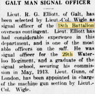 Elliott, Robert Gordon: Captain (Military Cross) Source: Galt Daily Reporter. May 19, 1915. Page 1.
