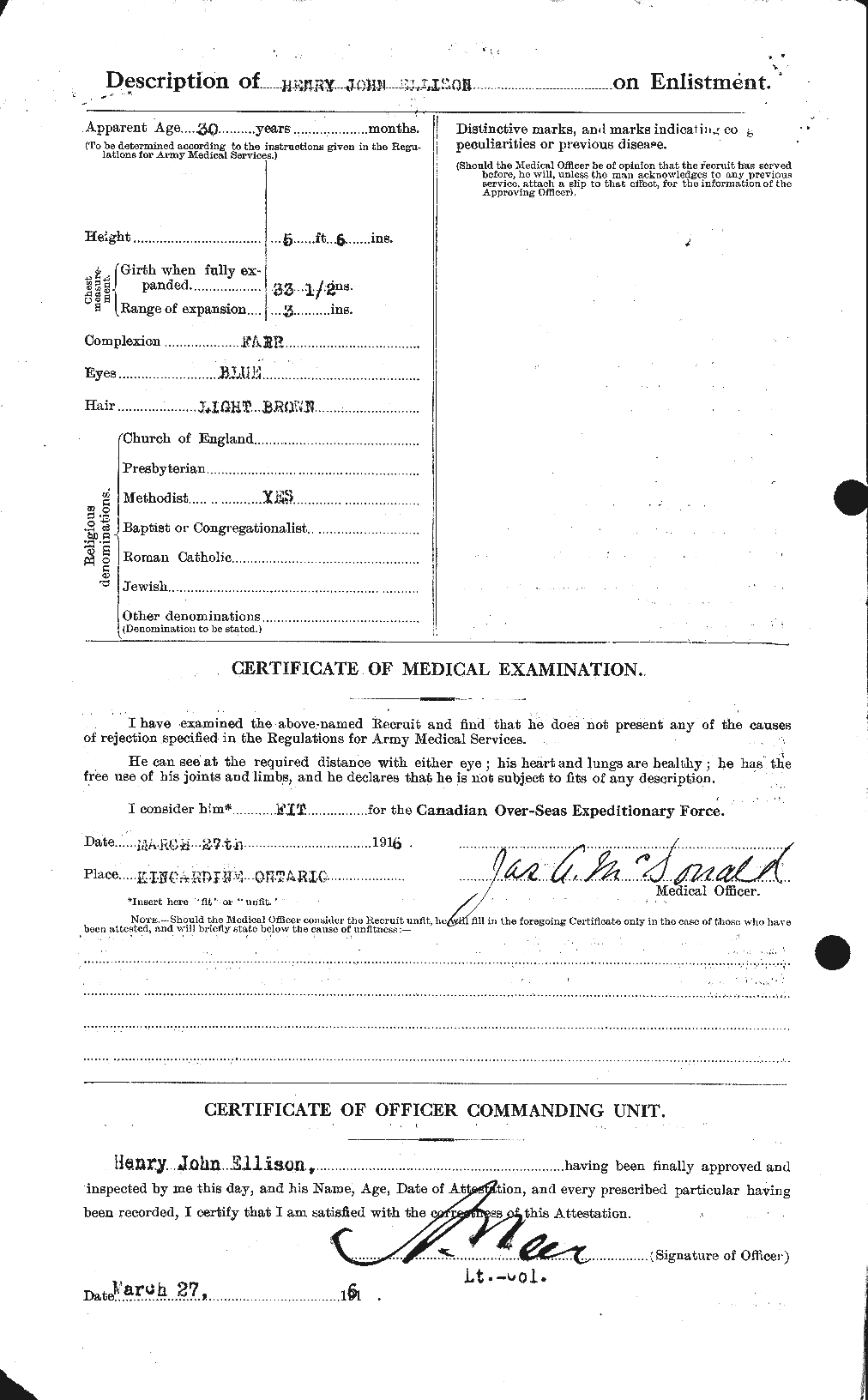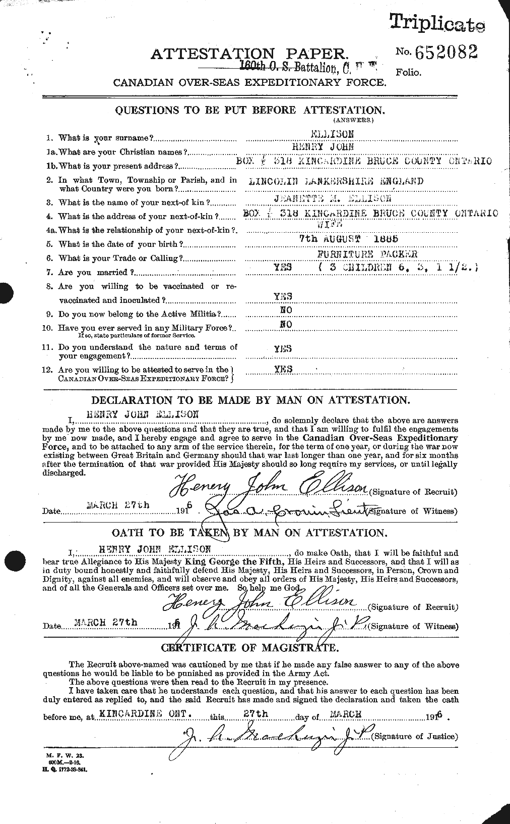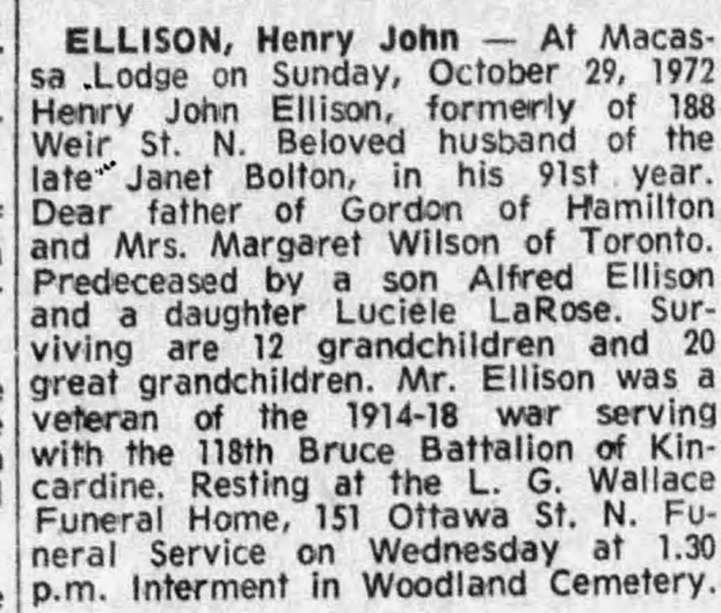 Family Search: Private Henry John Ellison was born on 7 August 1885, in Lincoln, Lincolnshire, England, United Kingdom as the son of Margret Bolton. He had at least 2 sons and 3 daughters with Jennett Minerva Bolton. He lived in Perth, Ontario, Canada in 1911. He registered for military service in 1916. In 1916, at the age of 31, his occupation is listed as furniture packer in Kincardine, Bruce, Ontario, Canada. He died on 29 October 1972, in Hamilton, Hamilton-Wentworth, Ontario, Canada, at the age of 87, and was buried in Woodland Cemetery, Hamilton, Ontario, Canada.