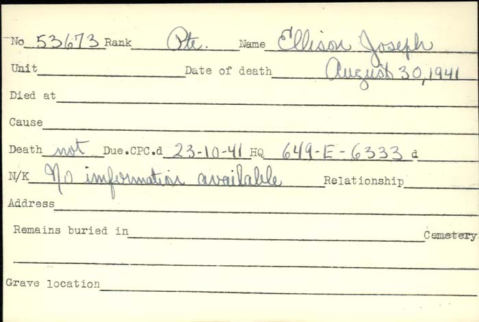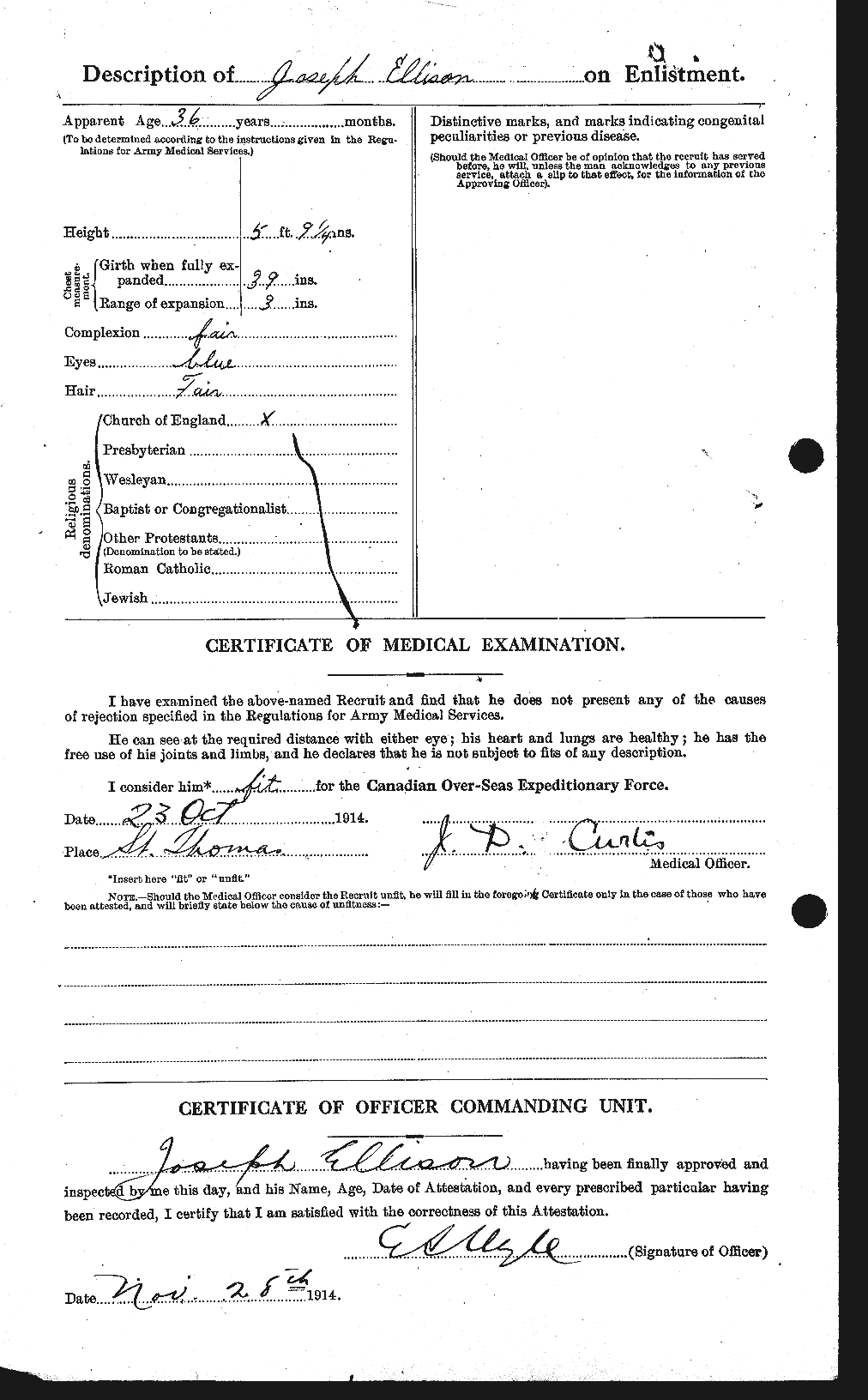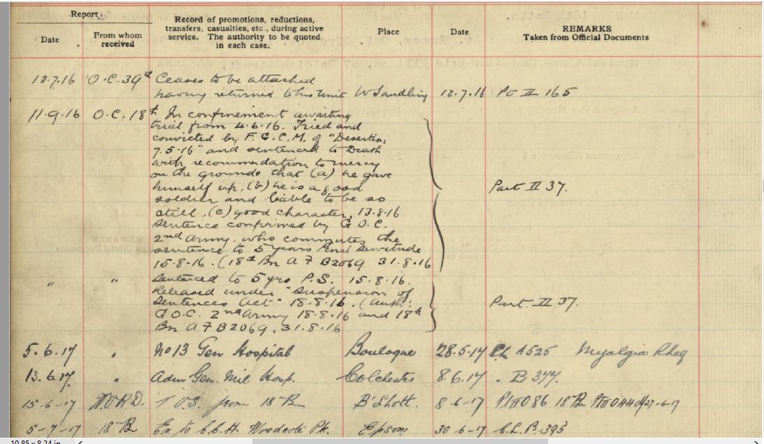 Charged with desertion, sentence to death (March 13, 1916) commuted to 5 Years Penal Servitude (September 16, 1916) and sentence remitted with effect from June 17, 1916. Survived the war.