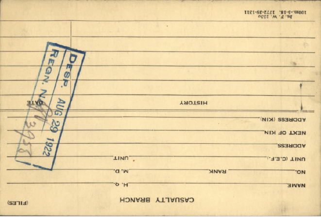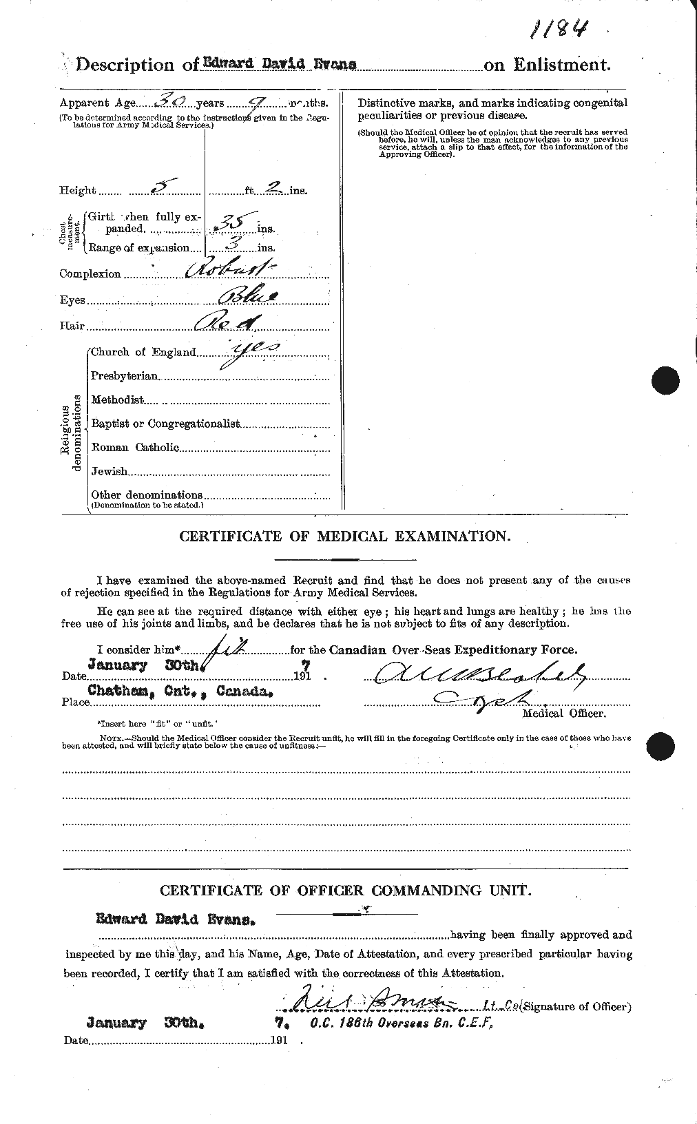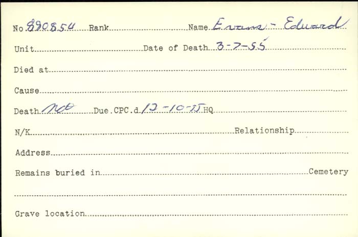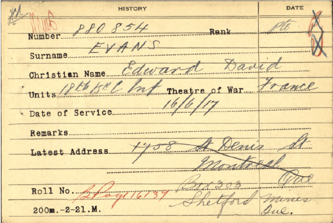 Family Search: Private Edward David Evans was born on 16 April 1886, in Wales, United Kingdom as the son of Robert Owen Evans. He married Jane Hughes on 27 September 1918, in Denbighshire, Wales, United Kingdom. He immigrated to Canada in 1913 and lived in Fonthill, Welland, Ontario, Canada in 1917. He registered for military service in 1917. In 1917, at the age of 31, his occupation is listed as labourer in Fonthill, Welland, Ontario, Canada. He died on 3 June 1955, at the age of 69.