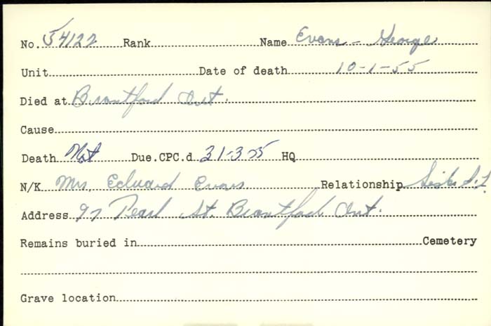 Private “Bike” Evan of local baseball fame, has been wounded. In Wednesday’s official casualty list he was given as being a resident of London. His address, however, should have been 21 Waterloo Street, Brantford. His wounding will recall the story of a single-handed grenade exploit he pulled off. Out on line scouting expedition “Bike” came to a German trench. Noises made it apparent that it was occupied and he called down and asked how many there were in the trench. Back in good English came the reply, “Eight.” “Then take these,” answered “Bike,” throwing a couple of handfuls of grenades amongst them.