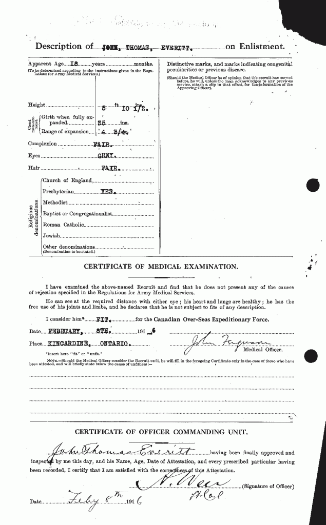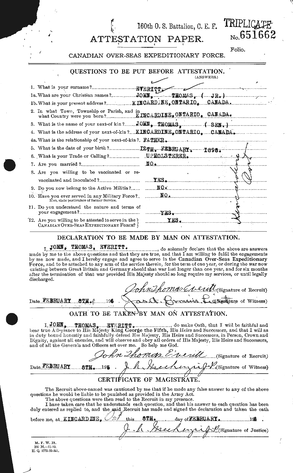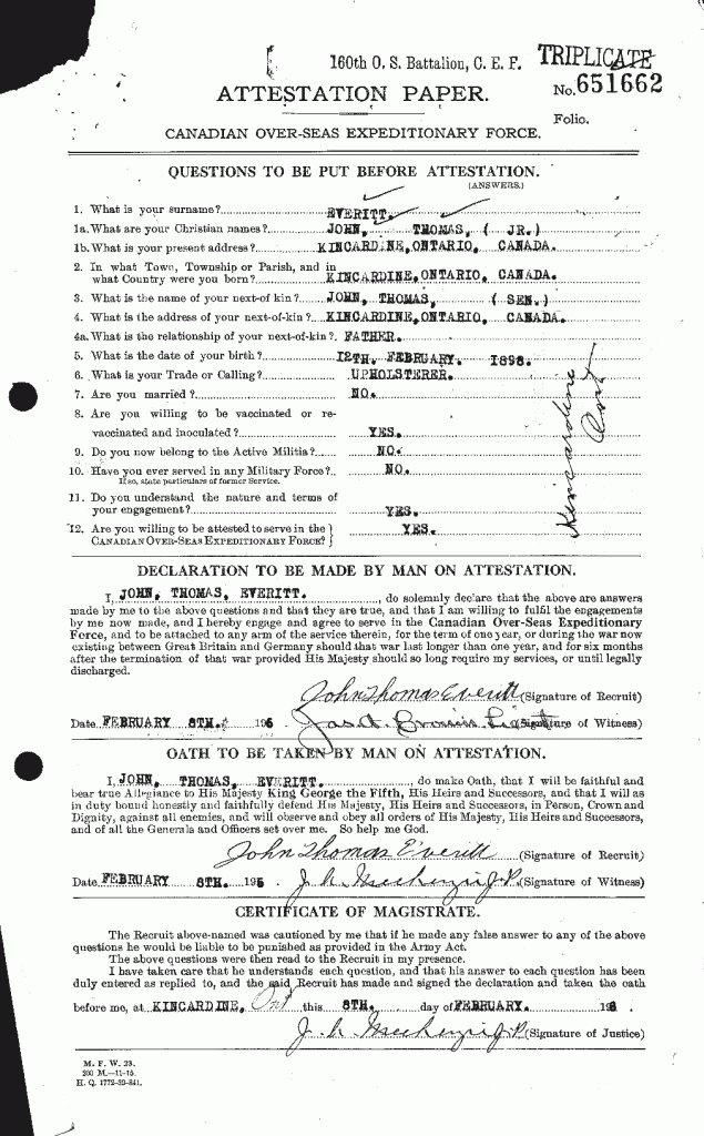 Omega hunter cased gold filled (plated) railroad grade pocket watch with a white porcelain dial showing hours, minutes, and seconds. Hunter cased with a hinged opening to the face, as well as to the reverse, and when opened, shows the engraving to back of the case. The hinged door to the reverse shows the engraved initials, with the engraved presentation to the back plate, reading, ‘For Duty Nobly Done Overseas, Great War 1914-1919, Pte. J.T.Everitt, From Kincardine Town. (Kincardine is a municipality located on the shores of Lake Huron in Bruce County) Government records show that he attestated on January 8th, 1916 at the age of 18 years with the 160th Battalion (Walkerton, Ontario) later serving with the 18th Battalion (London, Ontario) overseas in France where he received a bullet wound to the right shoulder. He discharged January 29, 1919 at the Number 1 District Depot, and was awarded the watch by the Mayor of Kincardine Ontario as a gift from the people of the town. Although not presently running, the watch has been checked and is complete with no damage and may require only something simple as a cleaning. A very rare and one-of-a-kind Canadian military item with strong WW1 history.