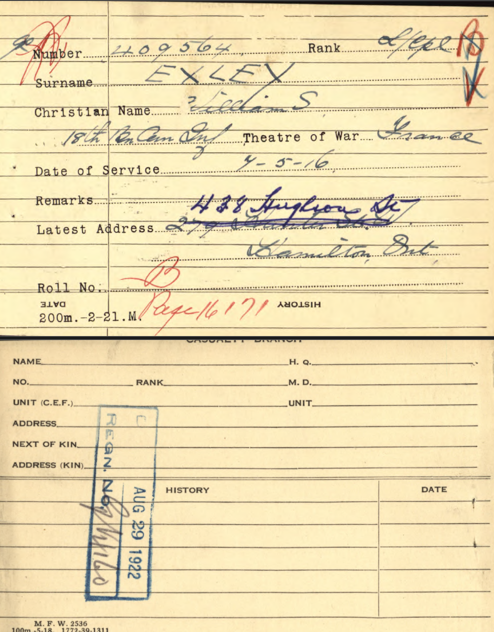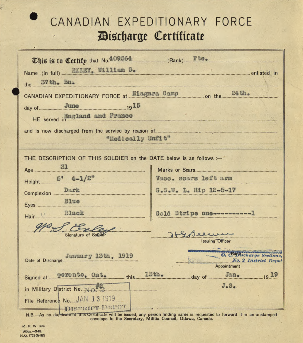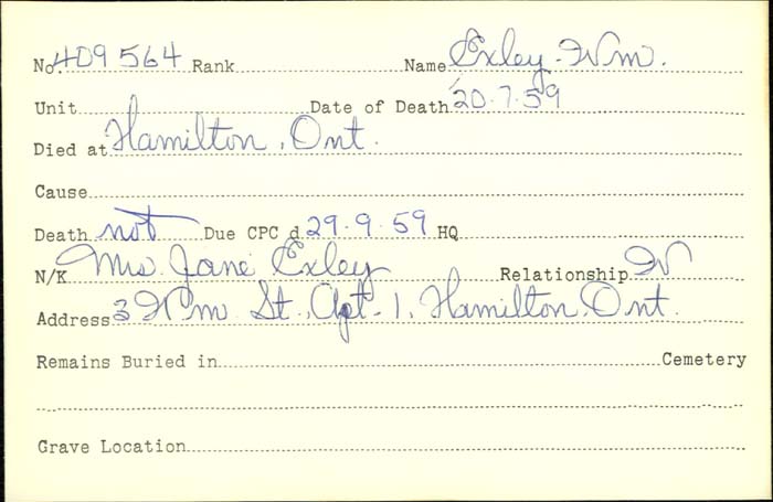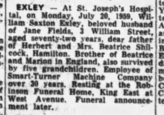 Family Search: When Private William Saxon Exley was born on 16 April 1887, in Yeadon, Yorkshire, England, United Kingdom, his father, Herbert Exley, was 36 and his mother, Matilda Foster, was 29. He married Jean Fields on 17 October 1910, in Hamilton, Hamilton-Wentworth, Ontario, Canada. They were the parents of at least 1 son. He immigrated to Detroit, Wayne, Michigan, United States in 1909 and lived in Haworth, Yorkshire, England, United Kingdom in 1901 and Hamilton, Wentworth, Ontario, Canada in 1931. In 1950, his occupation is listed as smart-turner machine company in Hamilton, Hamilton-Wentworth, Ontario, Canada. He died on 20 July 1957, in Hamilton, Hamilton-Wentworth, Ontario, Canada, at the age of 70.