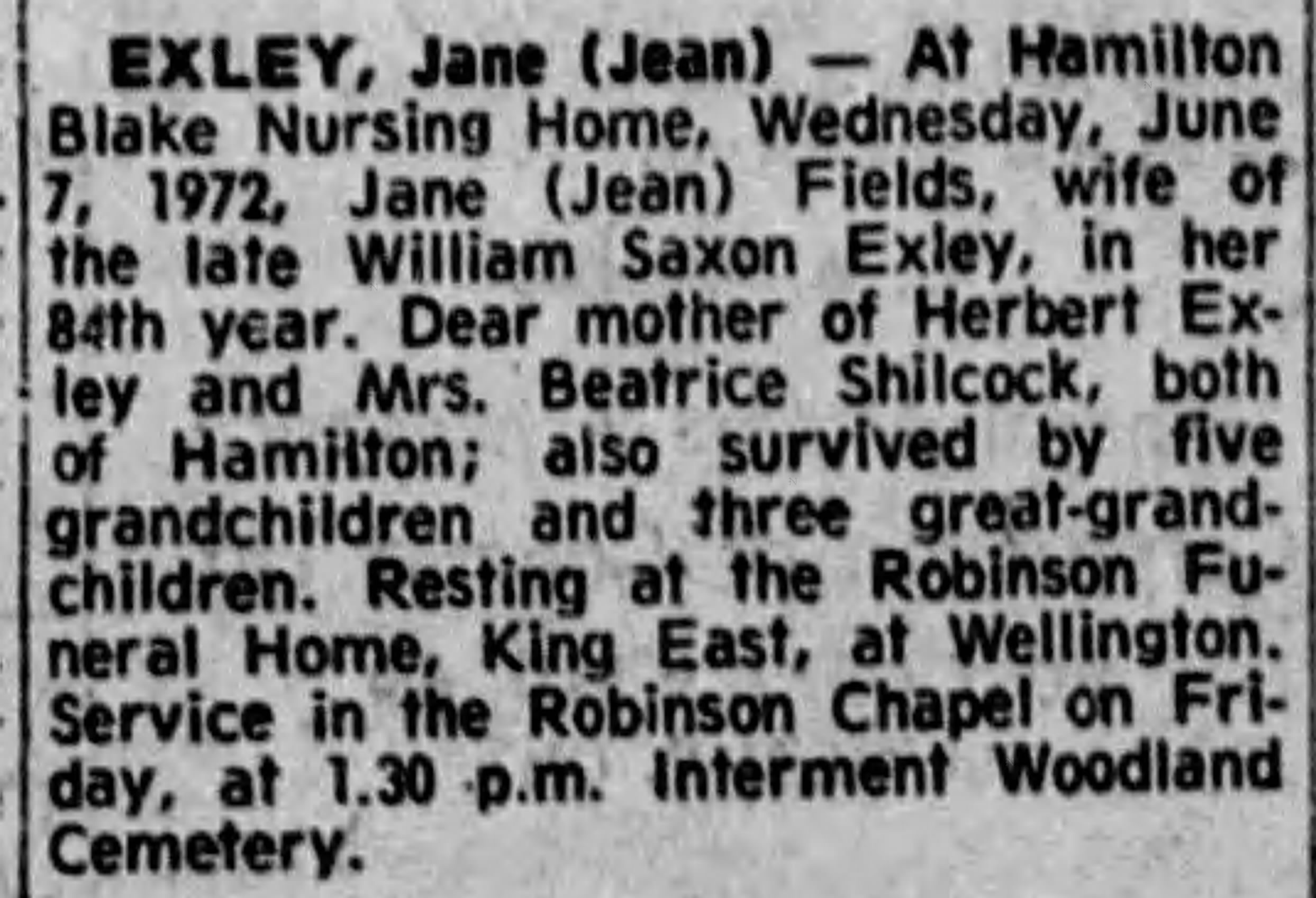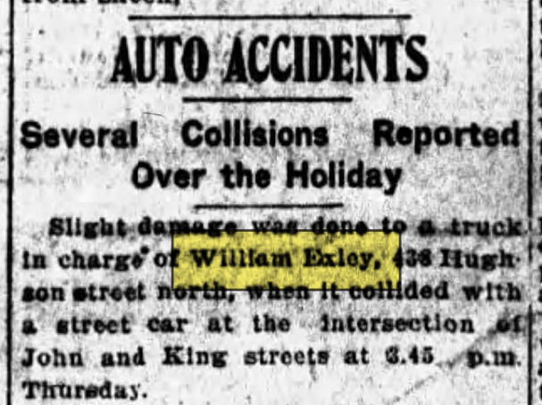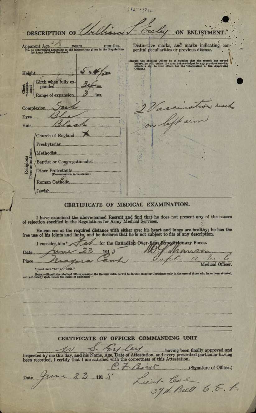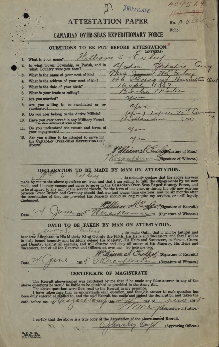 Family Search: When Private William Saxon Exley was born on 16 April 1887, in Yeadon, Yorkshire, England, United Kingdom, his father, Herbert Exley, was 36 and his mother, Matilda Foster, was 29. He married Jean Fields on 17 October 1910, in Hamilton, Hamilton-Wentworth, Ontario, Canada. They were the parents of at least 1 son. He immigrated to Detroit, Wayne, Michigan, United States in 1909 and lived in Haworth, Yorkshire, England, United Kingdom in 1901 and Hamilton, Wentworth, Ontario, Canada in 1931. In 1950, his occupation is listed as smart-turner machine company in Hamilton, Hamilton-Wentworth, Ontario, Canada. He died on 20 July 1957, in Hamilton, Hamilton-Wentworth, Ontario, Canada, at the age of 70.