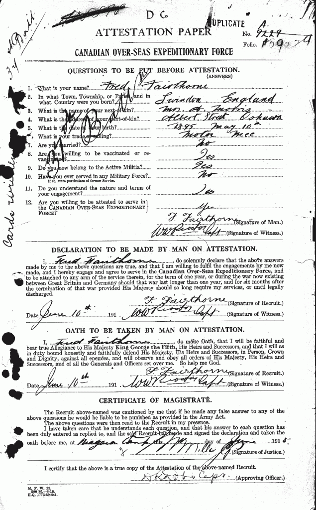 “Born in swindon on 08 May 1895 to Fredrick Thomas Fairthorne and Amelia Hatto. Frederick Thomas fairthorne had 4 children. He passed away on 24 Jun 1969 in High Wycombe, Buckinghamshire, England.”
