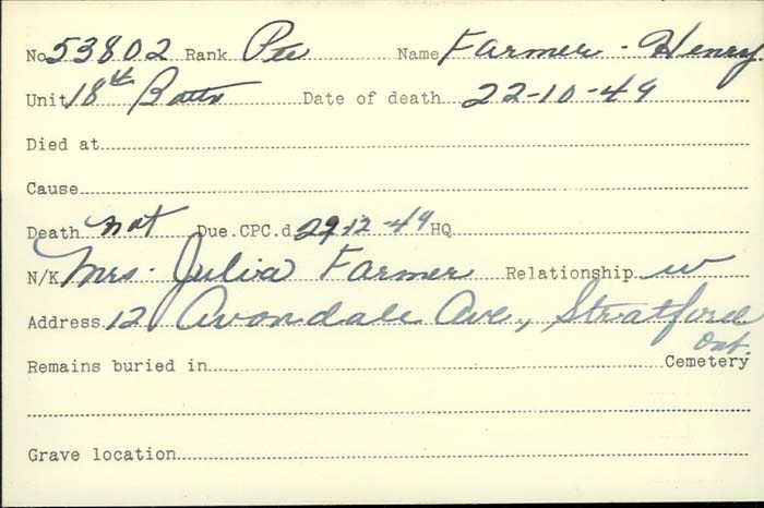 Farmer, Henry Horatio: Service no. 53802 Digitized Service Record Source: 18th Battalion Nominal Roll, April 1915. Find-A-Grave London Advertiser. June 23, 1915. Page 4. Share this: Click to email a link to a friend (Opens in new window) Email Click to share on Facebook (Opens in new window) Facebook Click to share on X (Opens in new window) X Click to share on Reddit (Opens in new window) Reddit Click to share on LinkedIn (Opens in new window) LinkedIn Click to print (Opens in new window) Print Click to share on Tumblr (Opens in new window) Tumblr Click to share on Pocket (Opens in new window) Pocket Click to share on Pinterest (Opens in new window) Pinterest Click to share on Telegram (Opens in new window) Telegram Click to share on WhatsApp (Opens in new window) WhatsApp Like Loading...