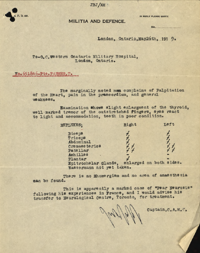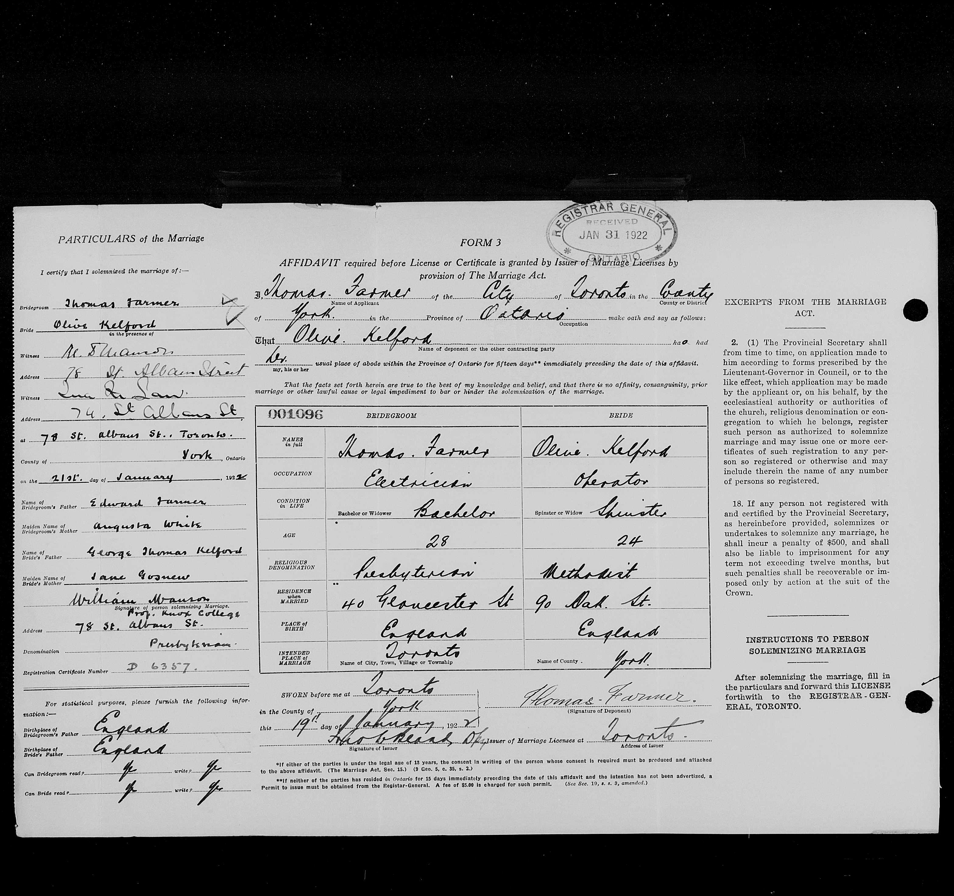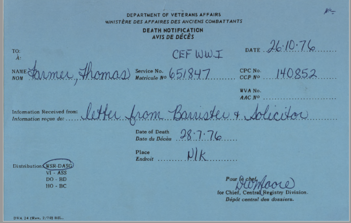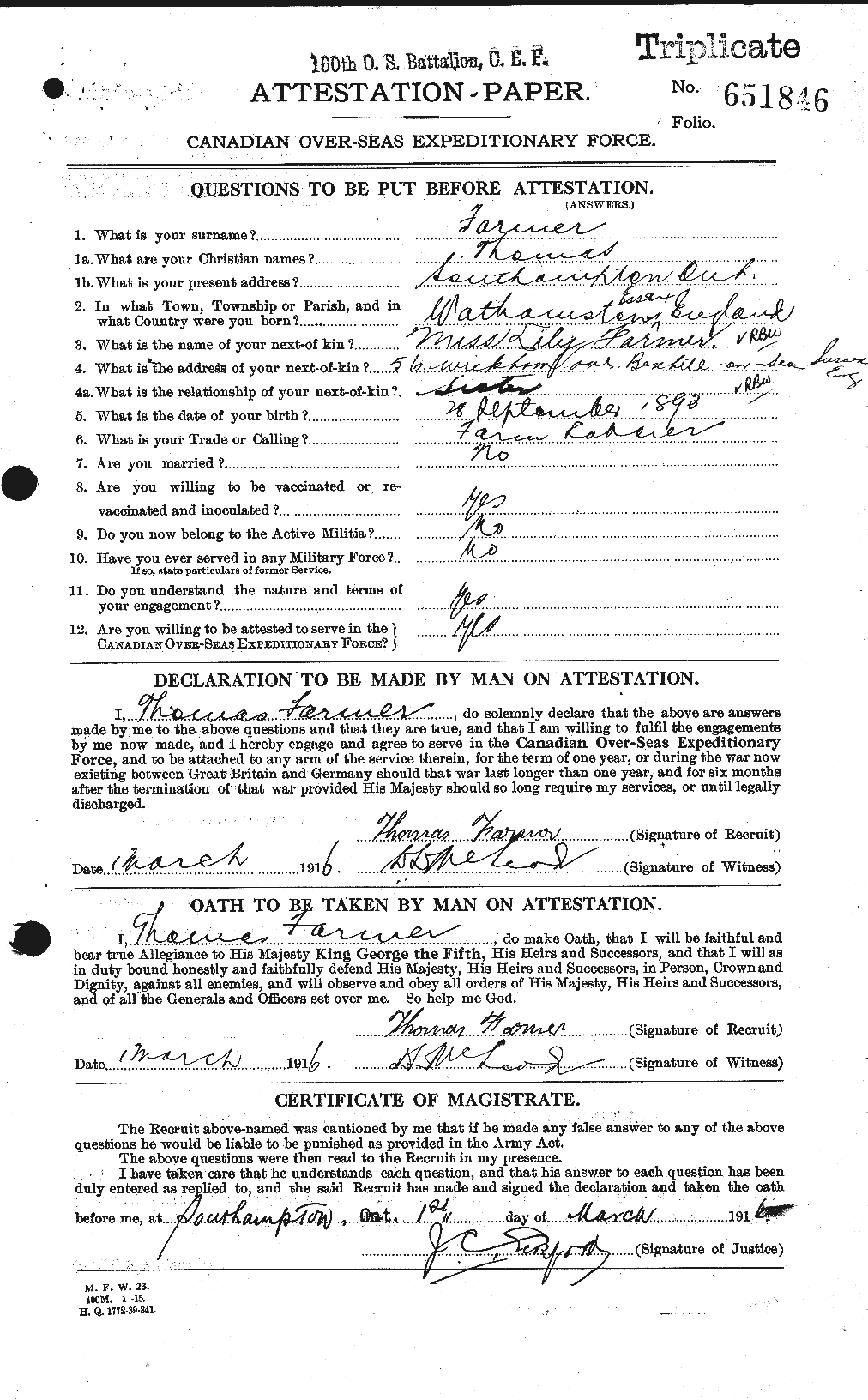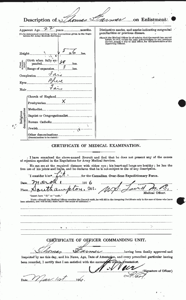 Family Search: Private Thomas Farmer was born on 28 September 1892, in Walthamstow, London, England, United Kingdom as the son of Edward Farmer and Augusta White. He married Olive Kelford on 19 January 1922, in Toronto, Ontario, Canada. He immigrated to Portland, Cumberland, Maine, United States in 1905 and lived in Southampton, Saugeen Shores, Bruce, Ontario, Canada in 1916 and Toronto, York, Ontario, Canada in 1922. He registered for military service in 1916. In 1916, at the age of 24, his occupation is listed as farm labourer in Southampton, Saugeen Shores, Bruce, Ontario, Canada. He died on 28 June 1976, in Kitchener, Waterloo, Ontario, Canada, at the age of 83, and was buried in Woodland Cemetery, Kitchener, Waterloo, Ontario, Canada.