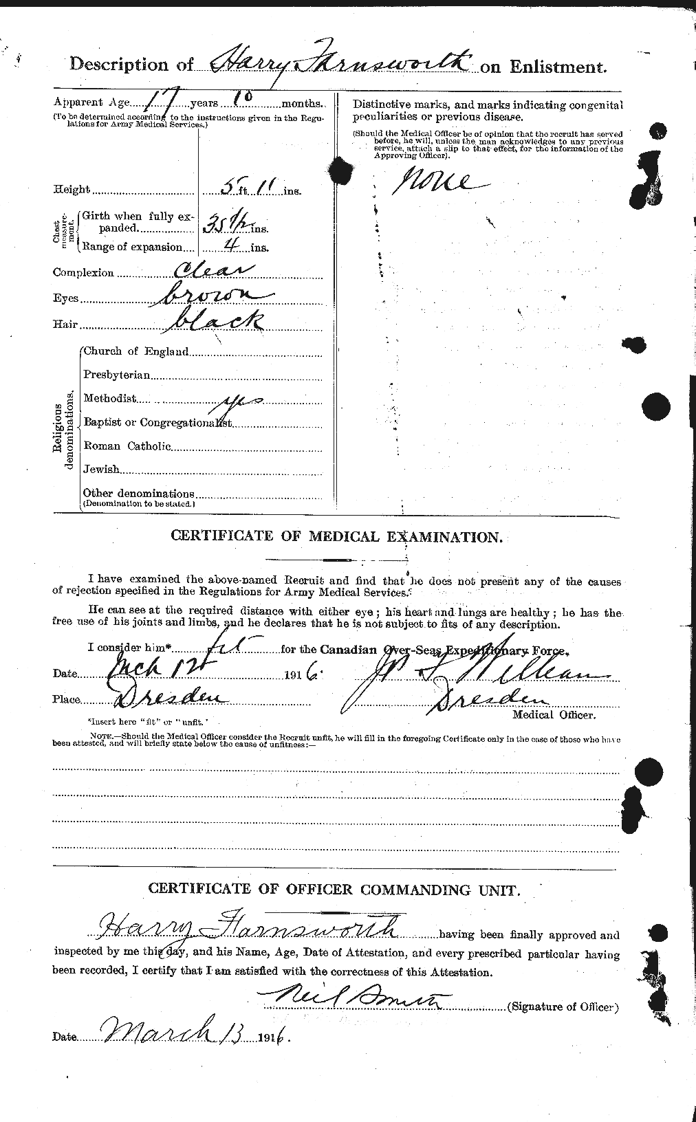 Find-A-Grave: When Private Harry Garnett Farnsworth was born on 25 May 1898, in Dresden, Kent, Ontario, Canada, his father, Samuel Farnsworth, was 36 and his mother, Ida May Carroll, was 28. He married Edna Margaret Eliza Glover in 1924. They were the parents of at least 1 son. He lived in Bothwell, Chatham-Kent, Ontario, Canada in 1901 and Kent, Georgian Highlands, Grey, Ontario, Canada in 1911. He registered for military service in 1916. In 1916, at the age of 18, his occupation is listed as student in Dresden, Kent, Ontario, Canada. He died on 17 July 1932, in Dresden, Kent, Ontario, Canada, at the age of 34, and was buried in Dresden Anglican Cemetery, Dresden, Chatham-Kent, Ontario, Canada.