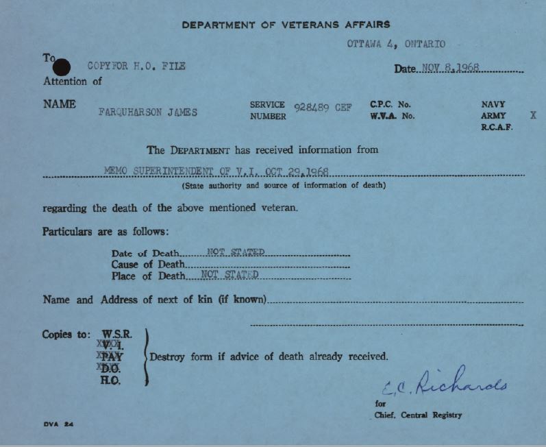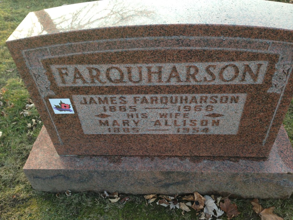 Family Search: Sergeant James Farquharson was born on 18 August 1885, in Aberlour, Banffshire, Scotland, United Kingdom as the son of Farquanson. He had at least 3 sons and 2 daughters with Mary Brownlie Allison. He immigrated to Canada in 1913 and lived in Palmerston, Wellington, Canada West, British North America in 1916 and Palmerston, Perth, Ontario, Canada in 1922. He registered for military service in 1916. In 1916, at the age of 31, his occupation is listed as fireman, grand trunk railway. He died on 13 October 1968, in Edmonton, Alberta, Canada, at the age of 83, and was buried in Palmerston Cemetery, Palmerston, Wellington, Canada West, British North America.