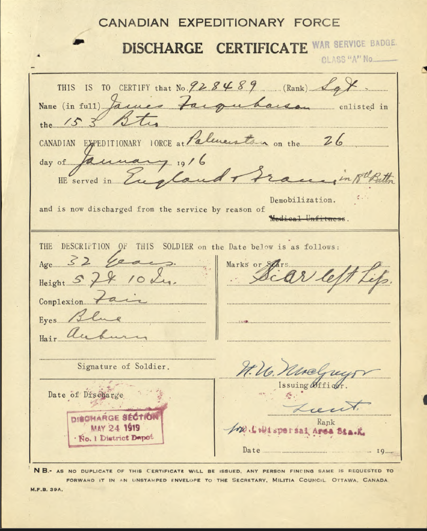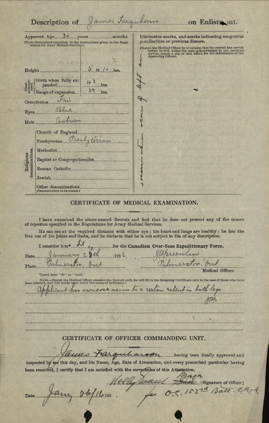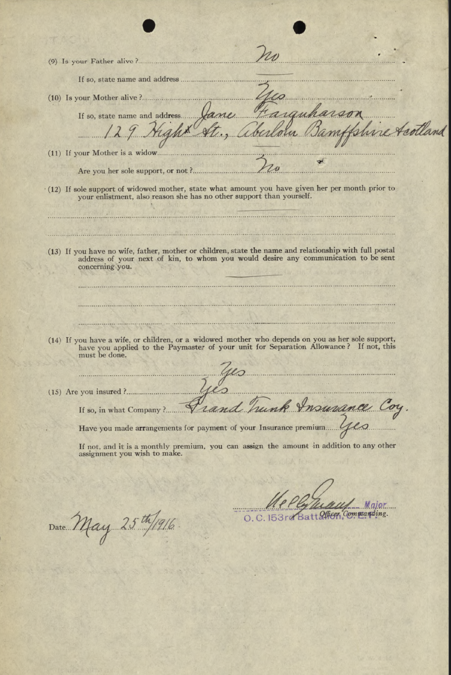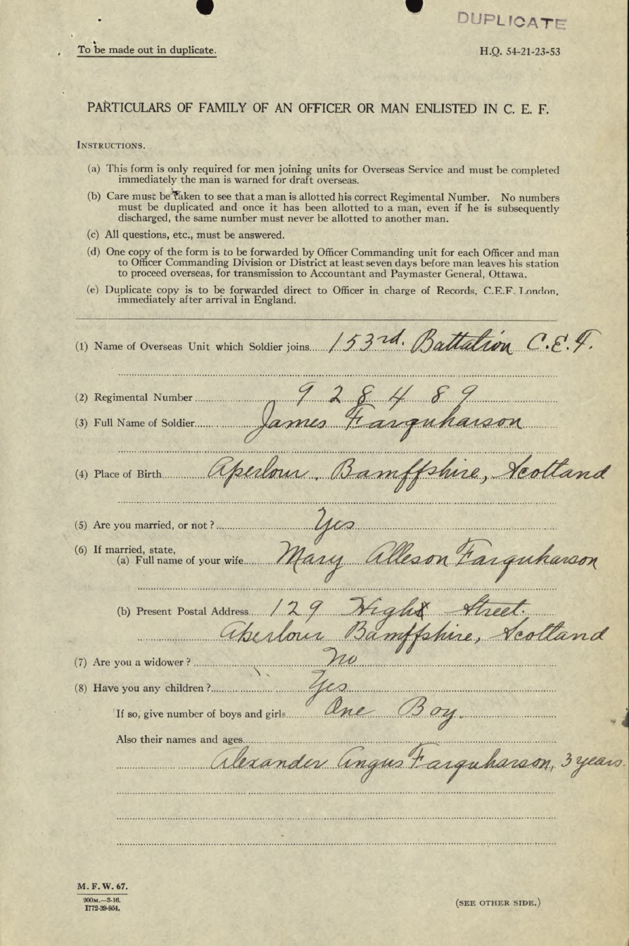 Trade listed as Fireman. DOB 18-8-85, born Aberlour, Bamffshire, Scotland. 5 foot 10 inches. Blue eyes, auburn hair. Presbyterian. NOK Mary Allison Farquharson, wife. Enlisted Palmerston 25-1-16 (age 30 years). On 153rd Nominal Roll 12-2-16, no transfer noted. On 153rd Nominal Roll as published Guelph Mercury 10-6-16.On 153rd Battalion Nominal Roll as published Guelph Mercury 1-12-16. Embarked with 153rd Halifax N.S. SS Olympic 29-4-17. Arrived Liverpool 7-5-17. Assigned 25th Reserve for Training and Administration. Taken on Strength 18th Battalion, 3-12-17. Returned to Canada aboard SS Caronia, Halifax N.S. 22-5-19. Demobilized London 24-5-19. Billion Graves: died 1968, buried Palmerston Cemetery, Palmerston, Section R.