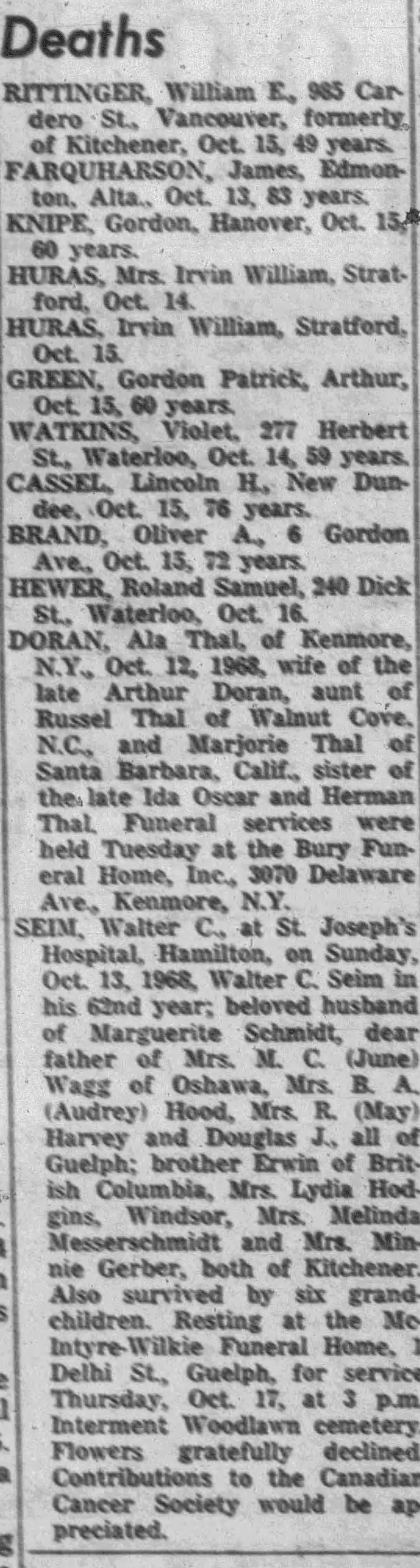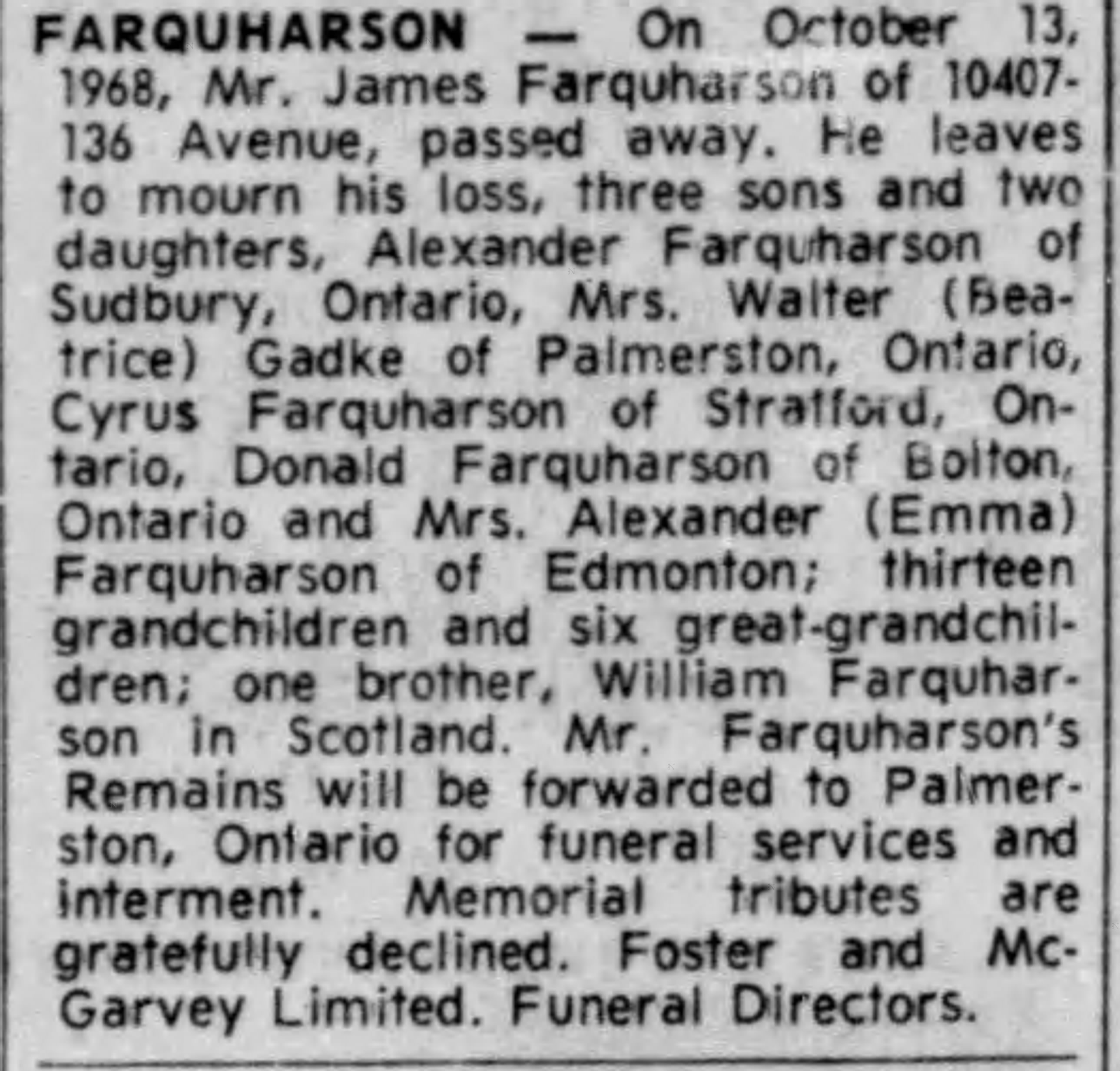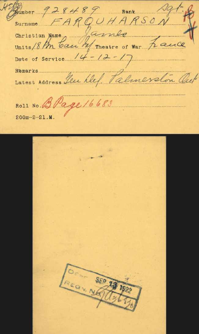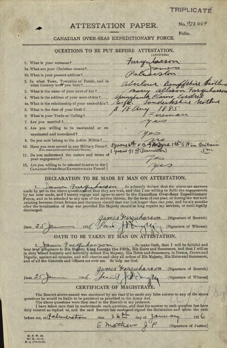 Trade listed as Fireman. DOB 18-8-85, born Aberlour, Bamffshire, Scotland. 5 foot 10 inches. Blue eyes, auburn hair. Presbyterian. NOK Mary Allison Farquharson, wife. Enlisted Palmerston 25-1-16 (age 30 years). On 153rd Nominal Roll 12-2-16, no transfer noted. On 153rd Nominal Roll as published Guelph Mercury 10-6-16.On 153rd Battalion Nominal Roll as published Guelph Mercury 1-12-16. Embarked with 153rd Halifax N.S. SS Olympic 29-4-17. Arrived Liverpool 7-5-17. Assigned 25th Reserve for Training and Administration. Taken on Strength 18th Battalion, 3-12-17. Returned to Canada aboard SS Caronia, Halifax N.S. 22-5-19. Demobilized London 24-5-19. Billion Graves: died 1968, buried Palmerston Cemetery, Palmerston, Section R.