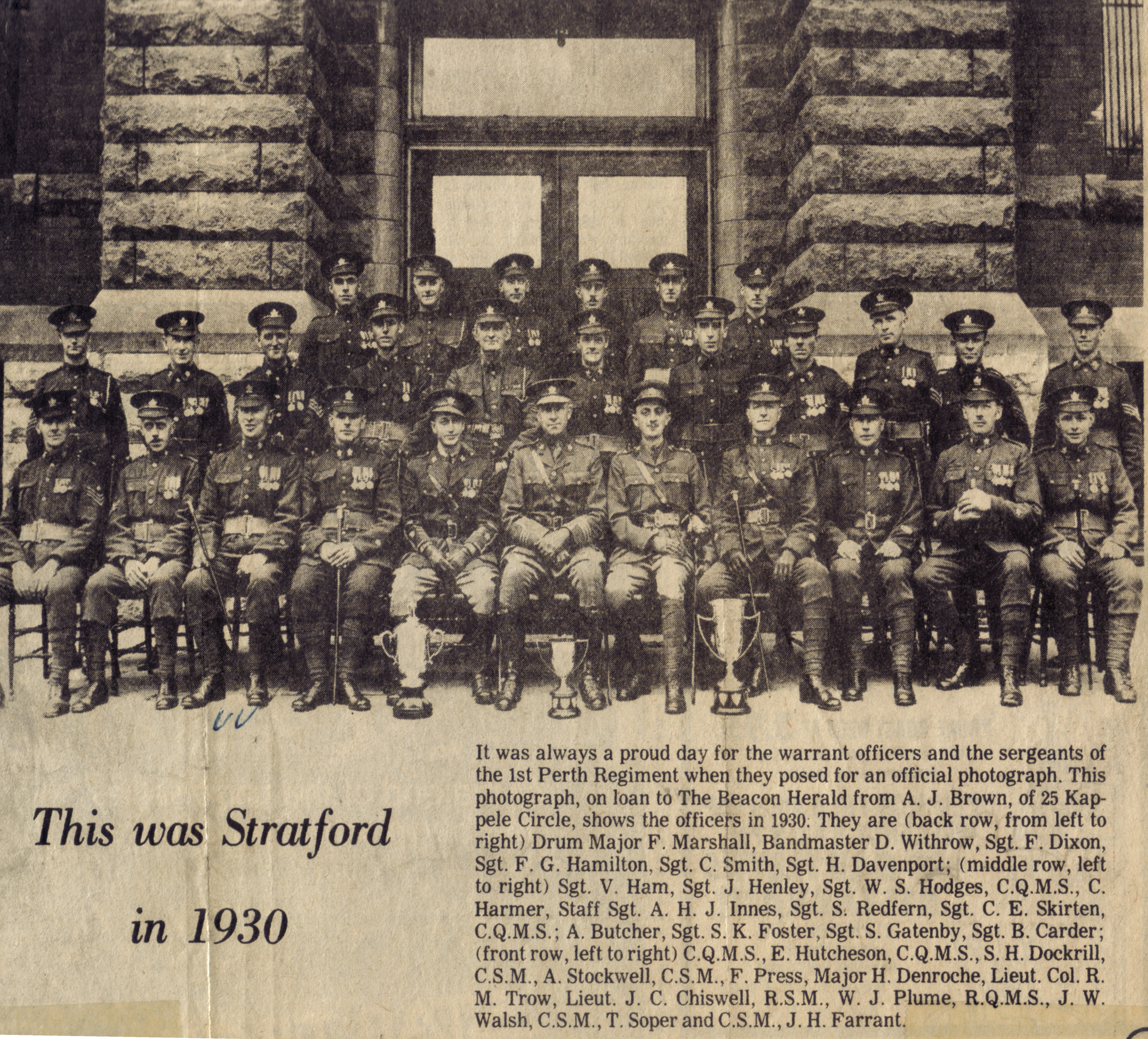 Source: Email via Dennis Nelson and attached photo of the 1st Perth Regiment, 1930. From Beacon Herald June 12, 1982.