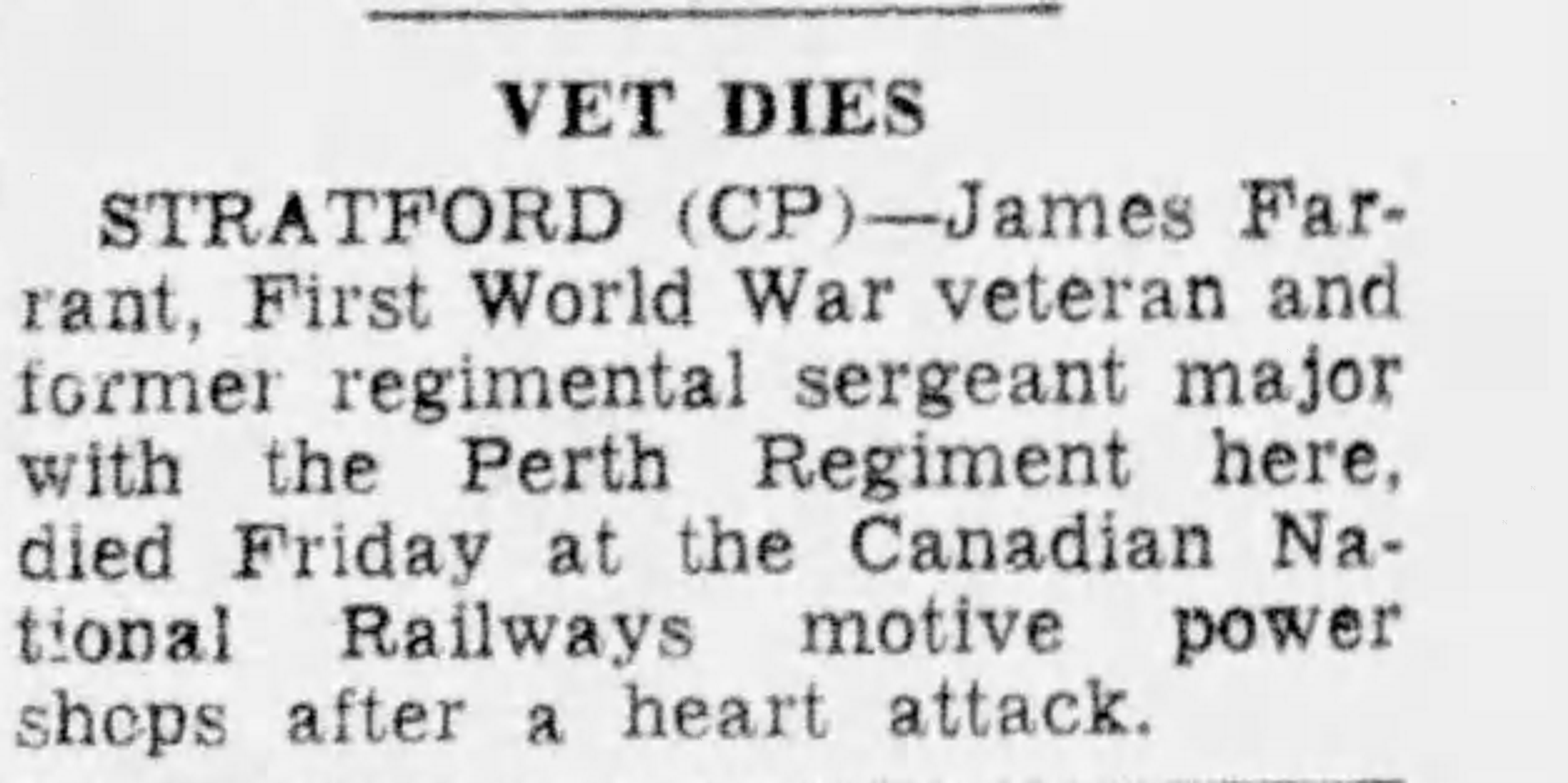 Family Search: When Private James Harold Farrant was born on 6 December 1897, in Fulham, London, England, United Kingdom, his father, Sanuel Edwin Farrant, was 31 and his mother, Jane Lake, was 30. He married Hilda Amanda Mansz on 26 August 1922, in Stratford, Perth, Ontario, Canada. They were the parents of at least 1 son. He immigrated to Quebec City, Quebec, Canada in 1908. He registered for military service in 1915. In 1915, at the age of 18, his occupation is listed as farming in Clinton, Huron, Ontario, Canada. He died on 11 June 1954, in Stratford, Perth, Ontario, Canada, at the age of 56, and was buried in Avondale Cemetery, Stratford, Perth, Ontario, Canada.