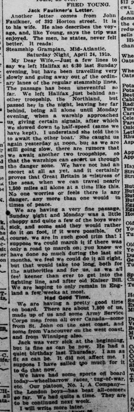 Note that his father, Private John Faulkner, reg. no. 53106, enlisted and served at the beginning of the Battalion’s duty on the Continent but was medically discharged. He may have been under age as his birth records show he was born 1898 or 1899.