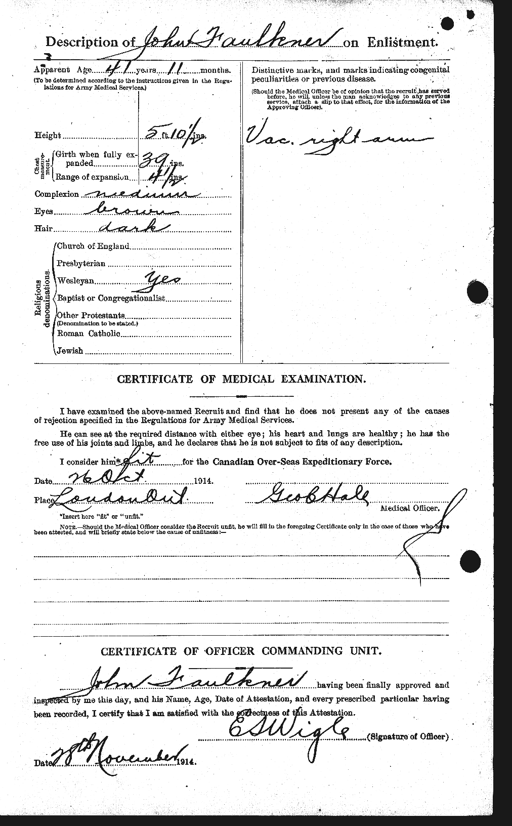Family Search: Private John Faulkner was born on 30 November 1874, in Manchester, Greater Manchester, England, United Kingdom. He had at least 1 son with Mary Elizabeth Watkins. He lived in London, Ontario, Canada in 1914. He registered for military service in 1914. In 1914, at the age of 40, his occupation is listed as travaller (sales) in London, Ontario, Canada. He died on 24 March 1949, in Toronto, York, Ontario, Canada, at the age of 74, and was buried in Prospect Cemetery, Toronto, Ontario, Canada.