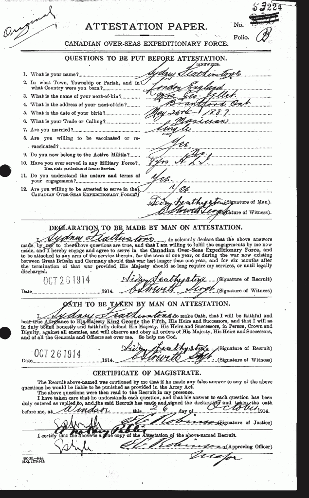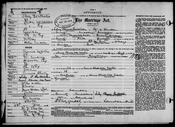 [S2061] Unknown author Family Search, Url: http://www.familysearch.org “Name: Sidney Clarence Featherstone Event Type: Marriage Event Date: 23 Dec 1914 Event Place: St Marys, Perth, Ontario, Canada Age: 26 Birth Year (Estimated): 1888 Father’s Name: William Mother’s Name: Helen Mason Spouse’s Name: Annie Rhoda Ada Martin Spouse’s Age: 18 Spouse’s Birth Year (Estimated): 1896 Spouse’s Father’s Name: Arthur Spouse’s Mother’s Name: Connie Peirey Page: 018412 Digital Folder Number: 004705221 GS Film Number: 002022058 , Image Number: 00859 ‘Ontario Marriages, 1869-1927,’ index, FamilySearch(https://familysearch.org/pal:/MM9.1.1/278Q-SLF : accessed 07 Jul 2014),Sidney Clarence Featherstone and Annie Rhoda Ada Martin, 23 Dec 1914;citing registration 018412, St Marys, Perth, Ontario, Canada, Archivesof Ontario, Toronto; FHL microfilm 002022058.”