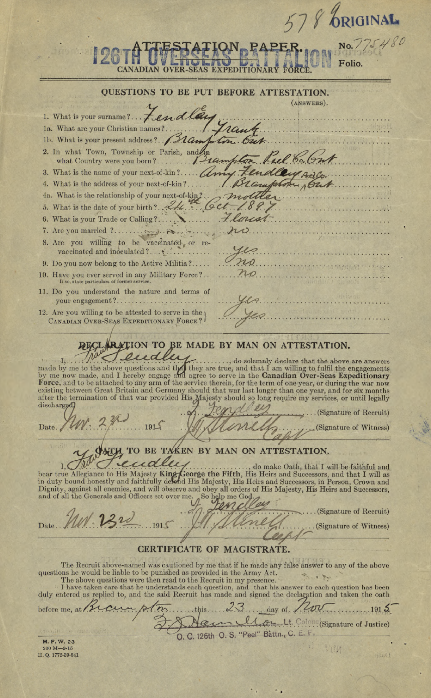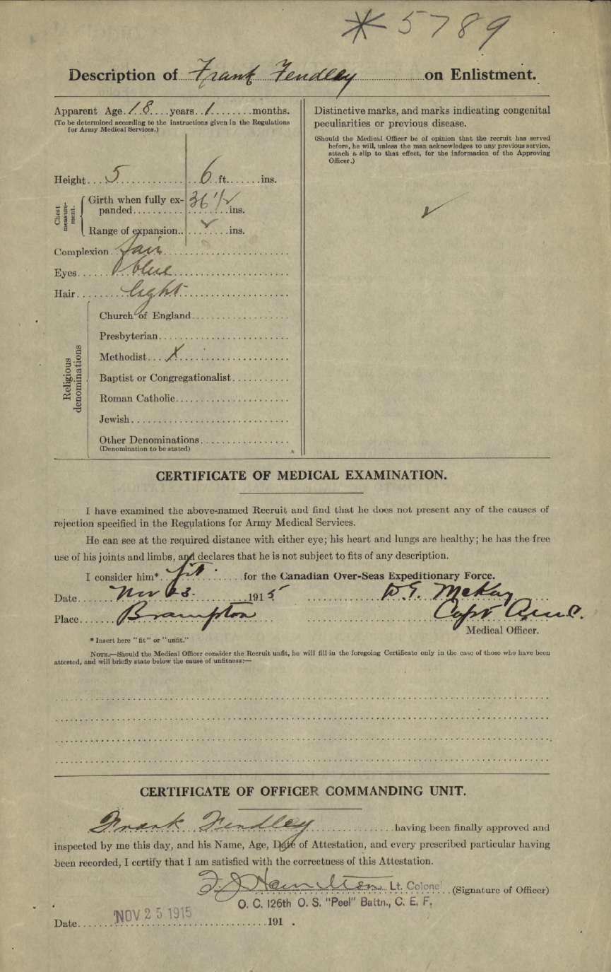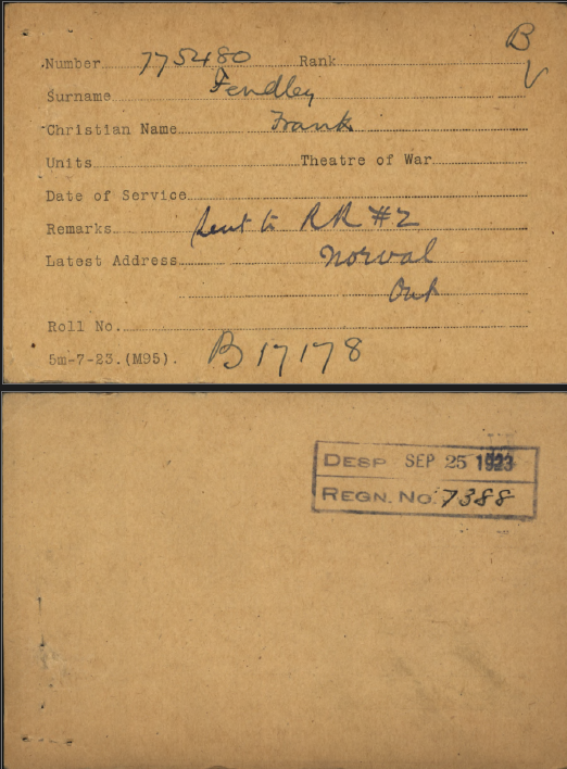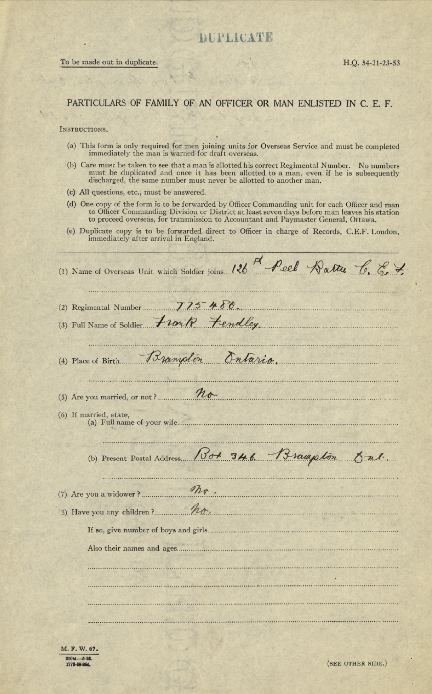 Family Search: When Private Frances Russell Fendley was born on 24 October 1897, in Brampton, Peel, Ontario, Canada, his father, Robert William Fendley, was 32 and his mother, Amy Dale, was 32. He married Hazel Gladys Early on 8 April 1922, in Toronto Gore, Peel, Ontario, Canada. They were the parents of at least 5 sons and 3 daughters. He lived in Peel, Ontario, Canada in 1911 and Esquesing Township, Halton, Ontario, Canada in 1931. He registered for military service in 1915. In 1931, at the age of 34, his occupation is listed as farmer in Esquesing Township, Halton, Ontario, Canada. He died on 19 September 1961, in Norval, Halton, Ontario, Canada, at the age of 63, and was buried in Brampton Cemetery, Brampton, Peel, Ontario, Canada.
