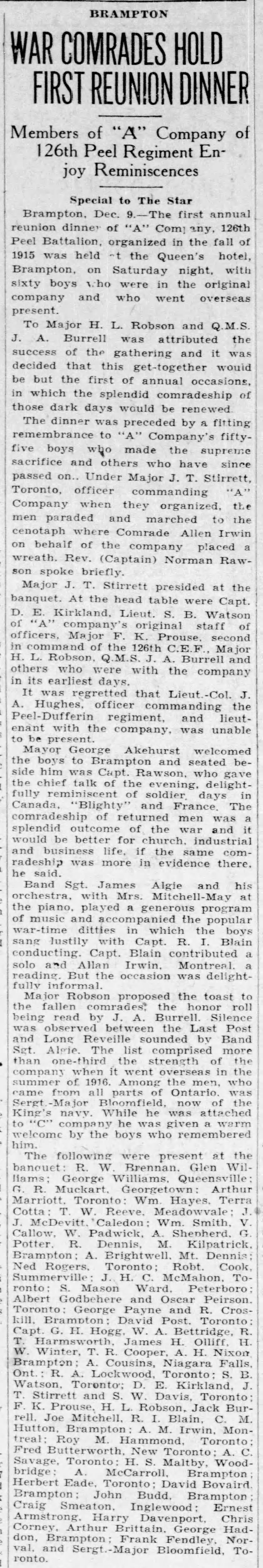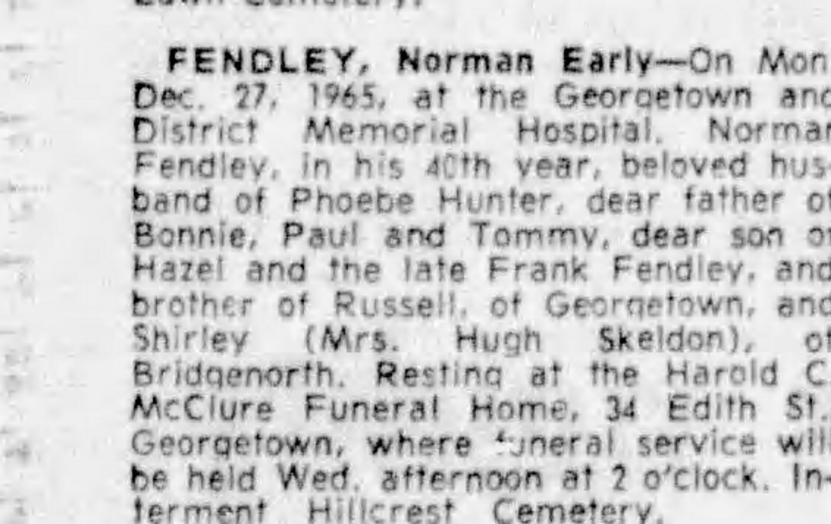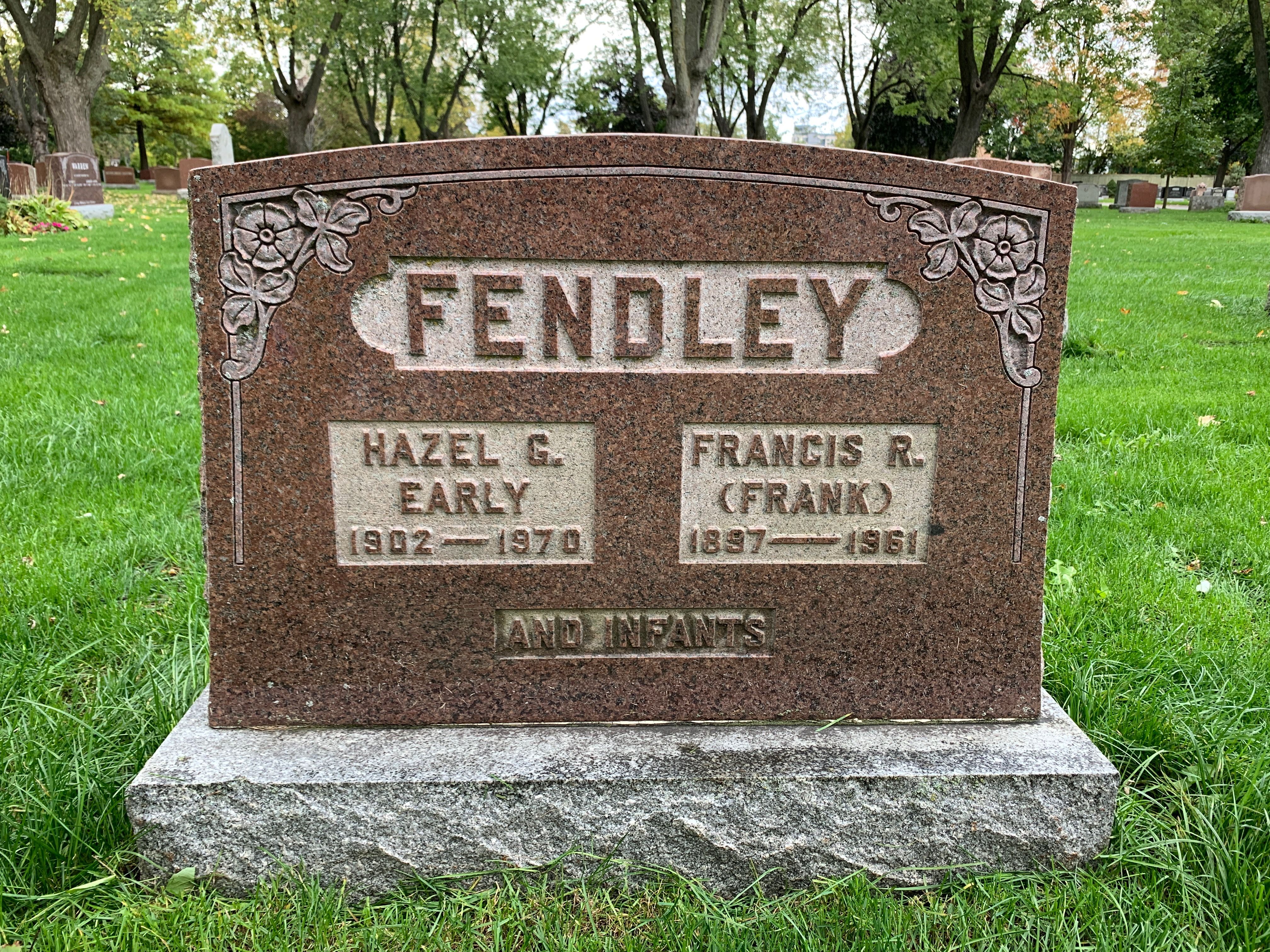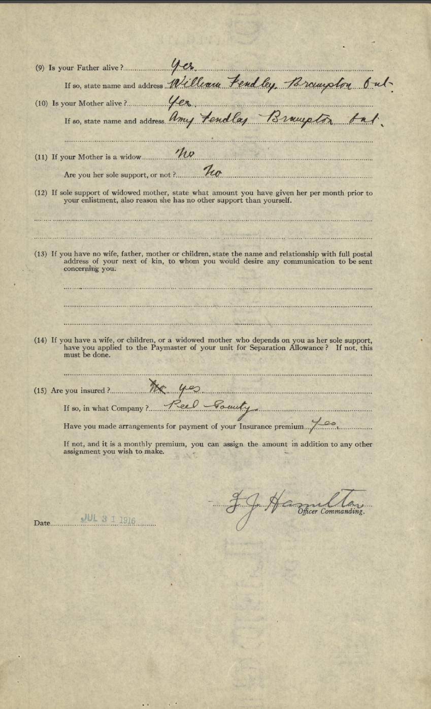 Family Search: When Private Frances Russell Fendley was born on 24 October 1897, in Brampton, Peel, Ontario, Canada, his father, Robert William Fendley, was 32 and his mother, Amy Dale, was 32. He married Hazel Gladys Early on 8 April 1922, in Toronto Gore, Peel, Ontario, Canada. They were the parents of at least 5 sons and 3 daughters. He lived in Peel, Ontario, Canada in 1911 and Esquesing Township, Halton, Ontario, Canada in 1931. He registered for military service in 1915. In 1931, at the age of 34, his occupation is listed as farmer in Esquesing Township, Halton, Ontario, Canada. He died on 19 September 1961, in Norval, Halton, Ontario, Canada, at the age of 63, and was buried in Brampton Cemetery, Brampton, Peel, Ontario, Canada.