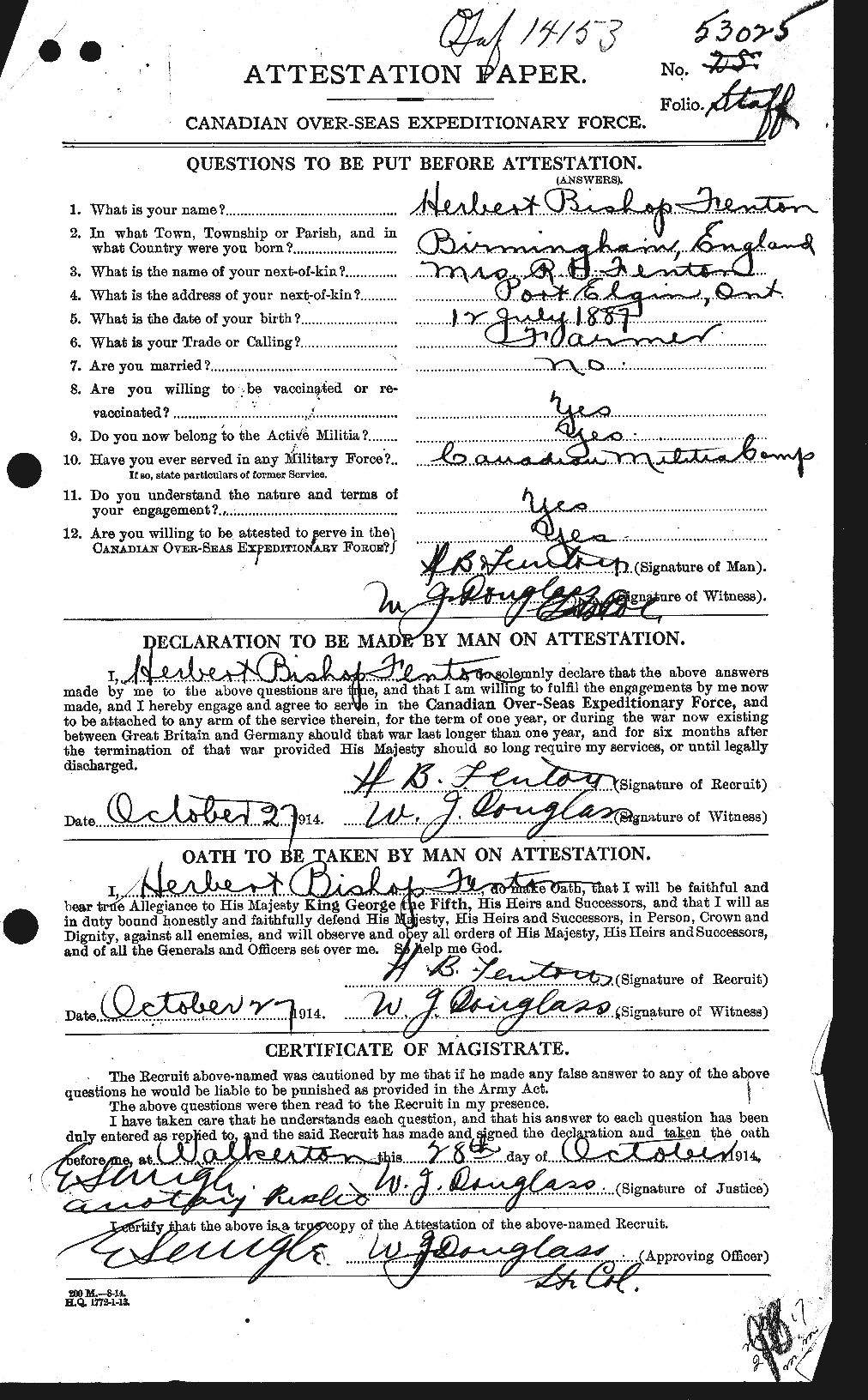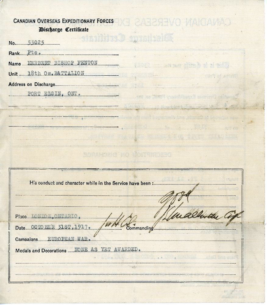 Family Search: When Herbert Bishop Fenton was born on 12 July 1887, in Birmingham, Warwickshire, England, United Kingdom, his father, John Bishop, was 38 and his mother, Charlotte Coles, was 36. He married Mabel Edna Seiffert on 6 February 1918, in Bruce Township, Bruce, Ontario, Canada. They were the parents of at least 3 sons and 2 daughters. He lived in Bruce, Ontario, Canada in 1911 and Bruce Township, Bruce, Ontario, Canada in 1931. He registered for military service in 1914. In 1914, at the age of 27, his occupation is listed as farmer in Bruce, Ontario, Canada. He died on 28 September 1954, in Port Elgin, Saugeen Shores, Bruce, Ontario, Canada, at the age of 67, and was buried in Sanctuary Park Cemetery, Saugeen Shores, Bruce, Ontario, Canada.