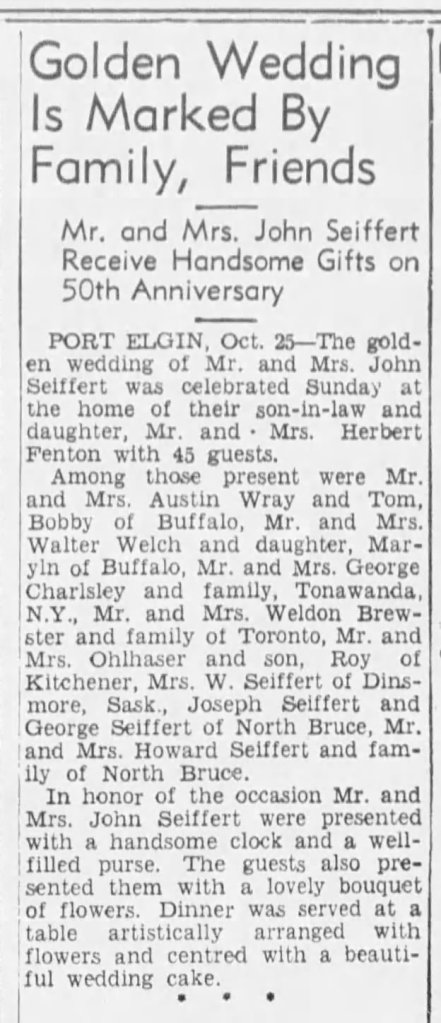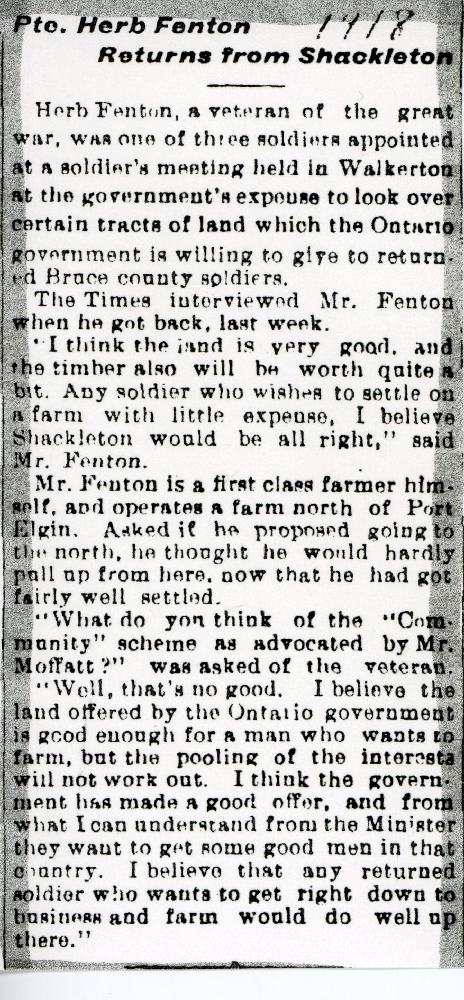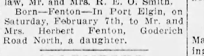 006815/1918 Herbert Bishop FENTON , 30, farmer, Birmingham Eng, Port Elgin, s/o John BISHOP & don’t know died young – adopted by Richard FENTON, married Mabel SEIFFERT, 26, farmers dau, Bruce Twp, same, d/o John SEIFFERT & Rebecca CLULY, witn: Minnie SEIFFERT of North Bruce & W G FENTON of Port Elgin, 6 Feb 1918 at Port Elgin. Source