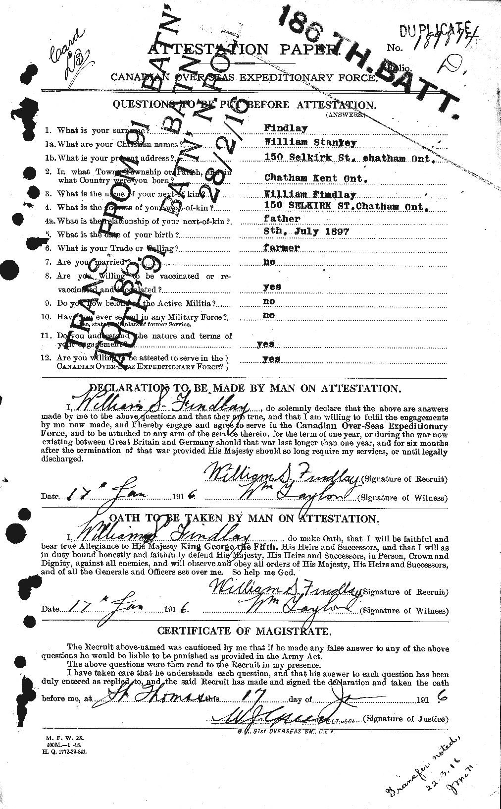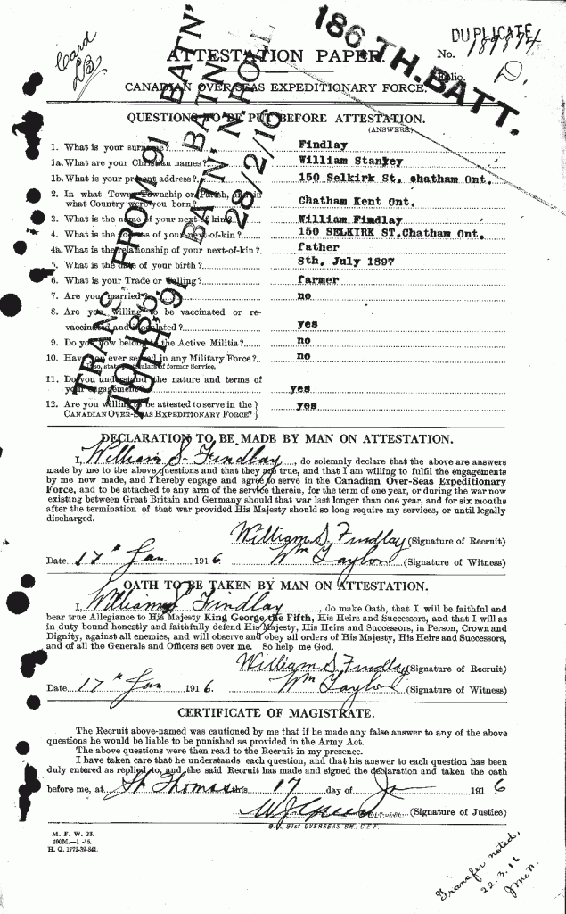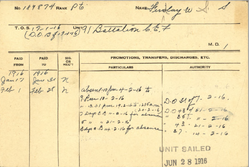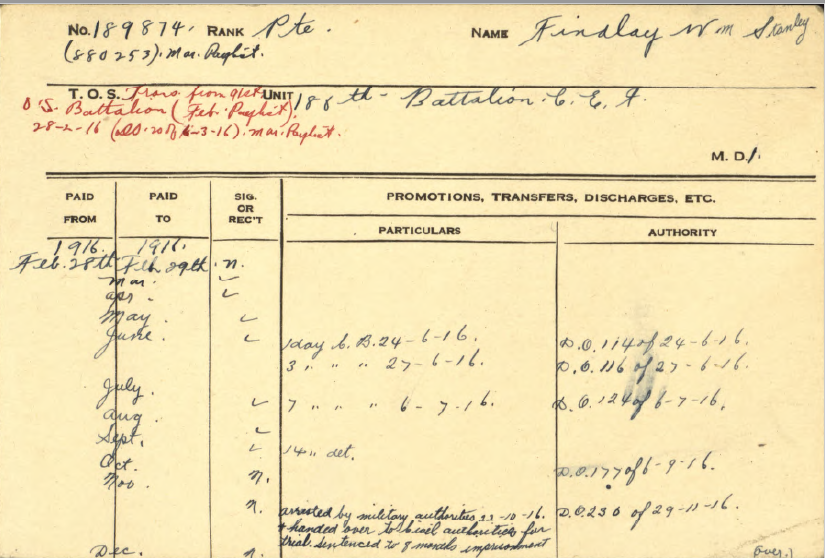 Findlay, William Stanley: Service no. 189874 Digitized Service Record Source: Per post by Allan Miller at the 18th Battalion Facebook Group. Find-A-Grave This soldier had disciplinary issues early in his service. Seems to have been OK once in the 18th. Share this: Click to email a link to a friend (Opens in new window) Email Click to share on Facebook (Opens in new window) Facebook Click to share on X (Opens in new window) X Click to share on Reddit (Opens in new window) Reddit Click to share on LinkedIn (Opens in new window) LinkedIn Click to print (Opens in new window) Print Click to share on Tumblr (Opens in new window) Tumblr Click to share on Pocket (Opens in new window) Pocket Click to share on Pinterest (Opens in new window) Pinterest Click to share on Telegram (Opens in new window) Telegram Click to share on WhatsApp (Opens in new window) WhatsApp Like Loading...