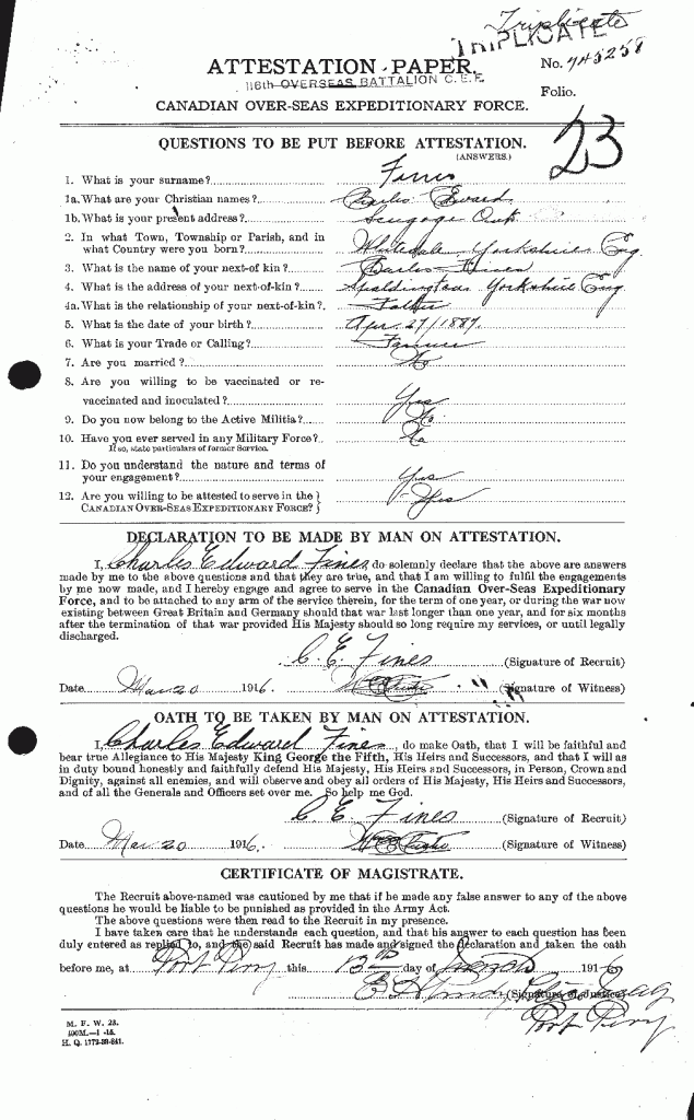 This man enlisted with the 116th Battalion (reg. no. 745258) on 20 May 1916 at Port Perry, Ontario.